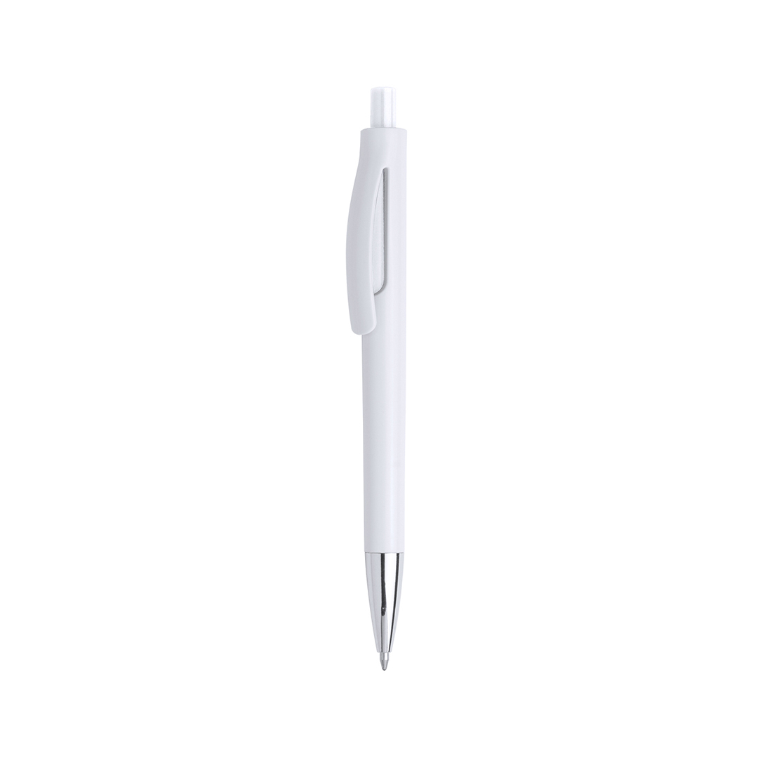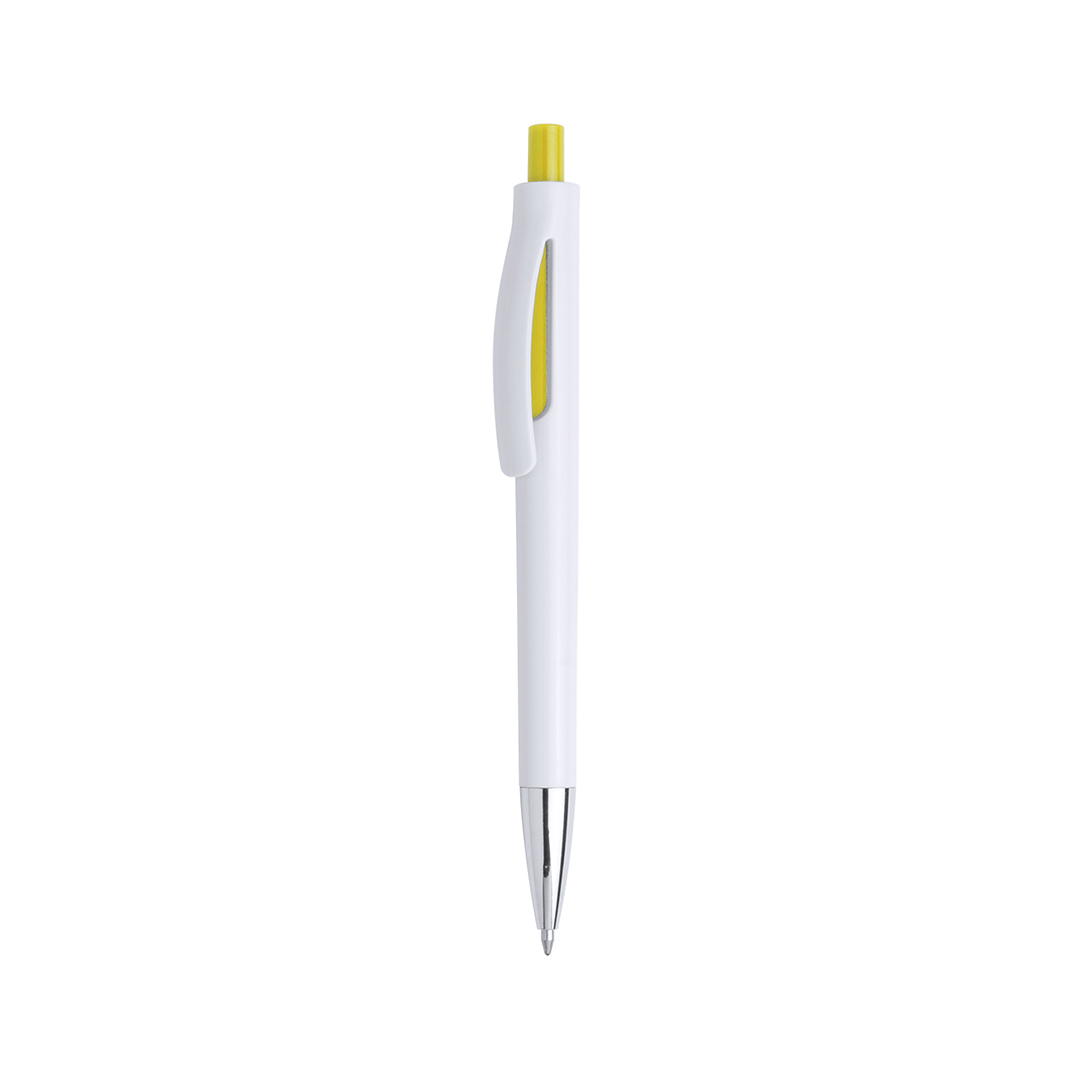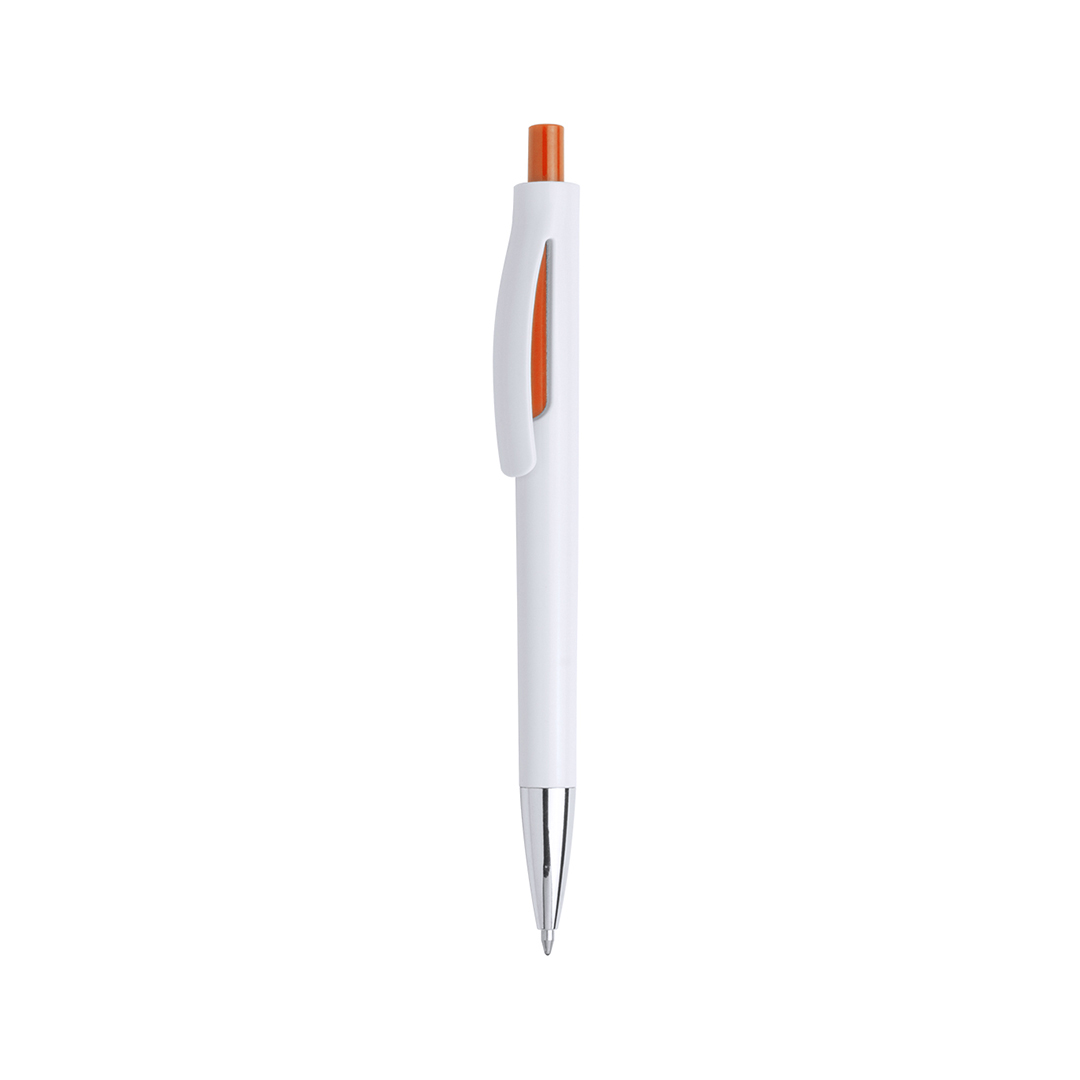 Bolígrafo de mecanismo pulsador de atrevido diseño bicolor con accesorios en vivos colores sólidos y cuerpo de suave acabado en color blanco sólido. Con original clip curvado a juego y punta en acabado brillante. Tinta azul.