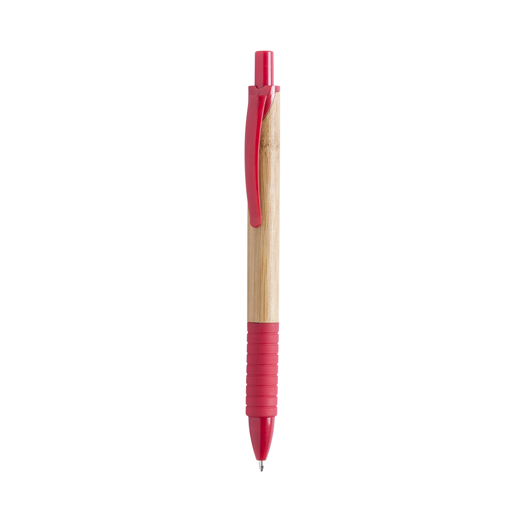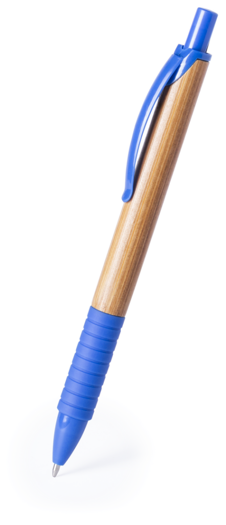 Bolígrafo de mecanismo pulsador en original combinación de cuerpo en madera de bambú natural y accesorios en variada gama de vivos colores. Cómoda empuñadura a juego y tinta azul.