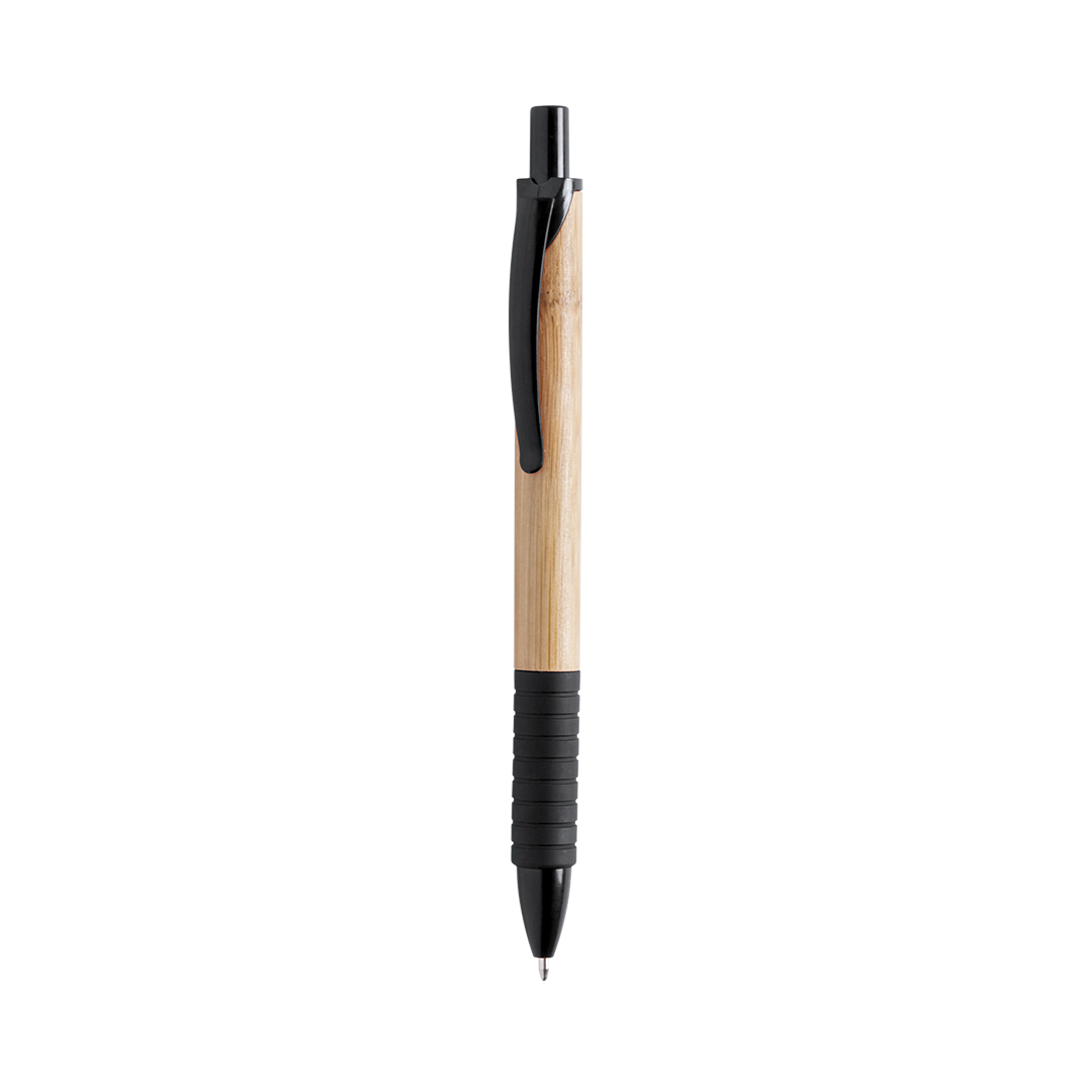 VerdeBolígrafo de mecanismo pulsador en original combinación de cuerpo en madera de bambú natural y accesorios en variada gama de vivos colores. Cómoda empuñadura a juego y tinta azul.