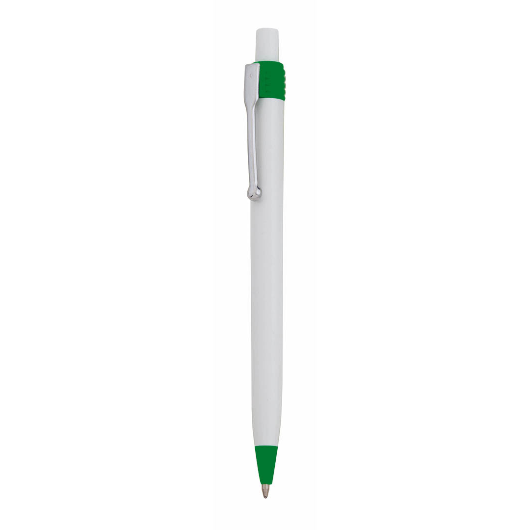 VerdeBolígrafo de mecanismo pulsador de atrevido diseño bicolor con accesorios en vivos colores y cuerpo de suave acabado en color blanco. Con clip metálico y tinta azul. De cartucho jumbo. Carga Jumbo