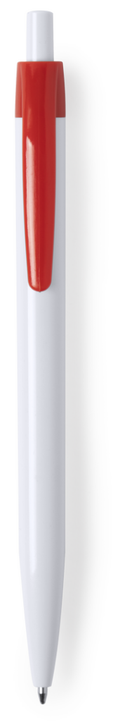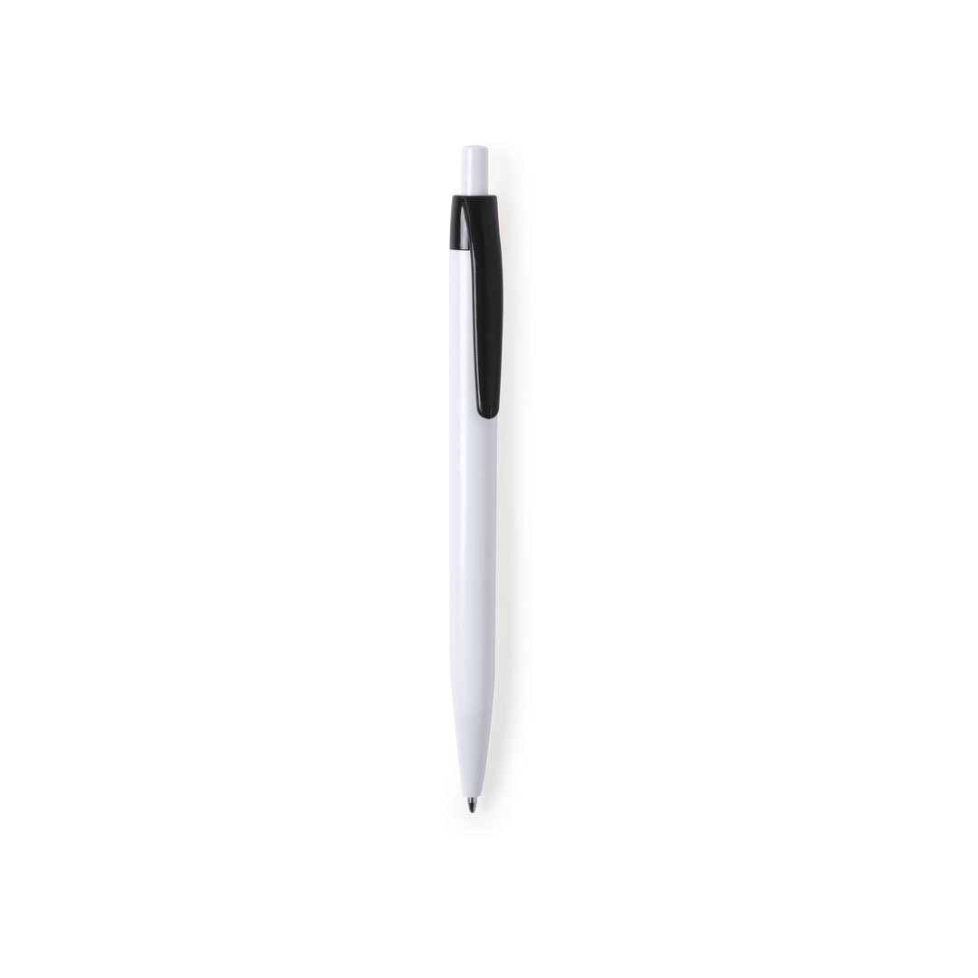 Bolígrafo de mecanismo pulsador en desenfadado diseño bicolor. Con cuerpo en color blanco y clip en variada gama de colores. Amplia superficie de impresión y en tinta azul.