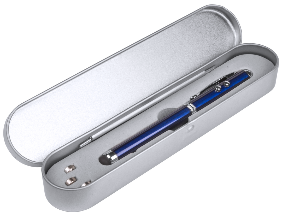 Bolígrafo láser con capucha, de mecanismo giratorio y elegante acabado metálico brillante. Incorpora pulsadores de activación laterales, práctico clip de fijación, capucha con puntero táctil y cuerpo curvado, especialmente diseñado para marcaje en láser. 1 Led. Pilas Botón Incluidas