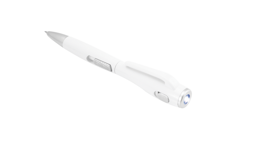 Bolígrafo con linterna led integrada. De mecanismo pulsador lateral y en diseño minimalista de original combinación de colores gris y blanco. En tinta azul y con pilas de botón incluidas. 1 Led. Pilas Botón Incluidas