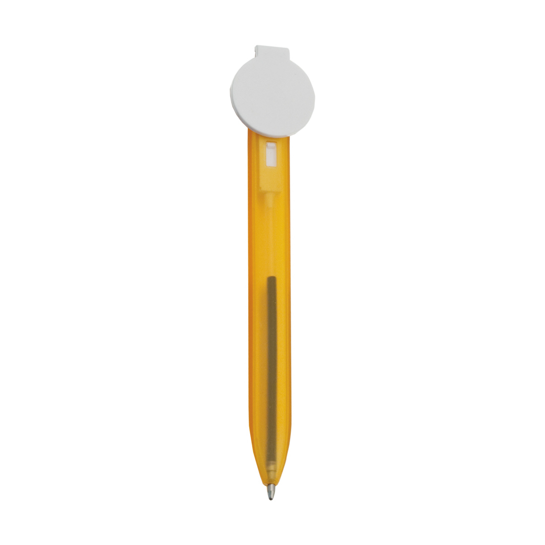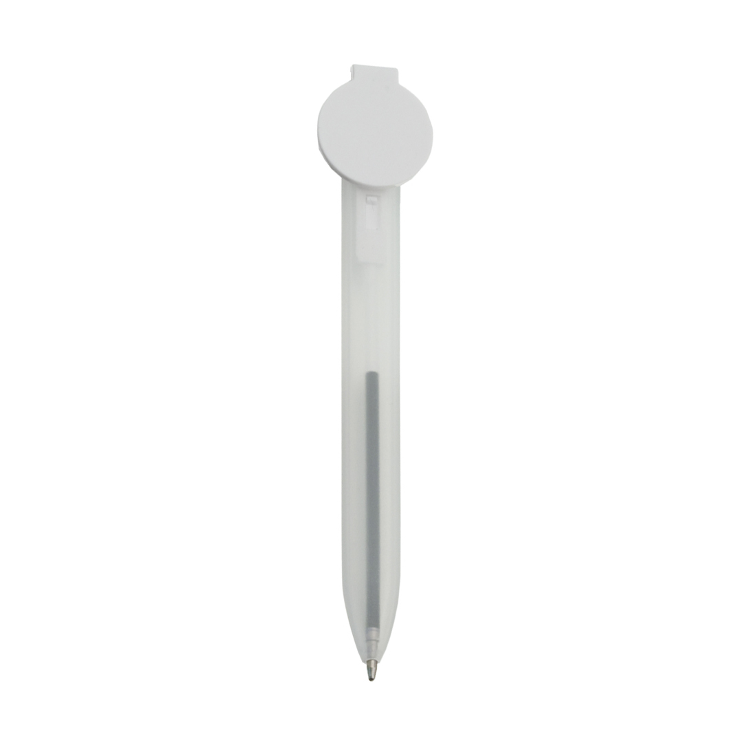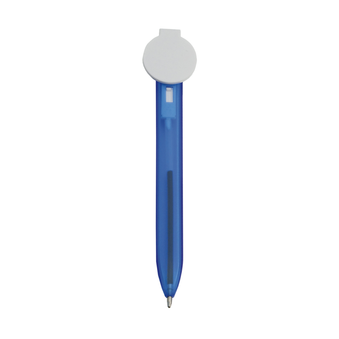 Bolígrafo marcapáginas en original diseño bicolor, con cuerpo translúcido y mecanismo de pulsador. Con zona de marcaje circular para impresión en tampografía.