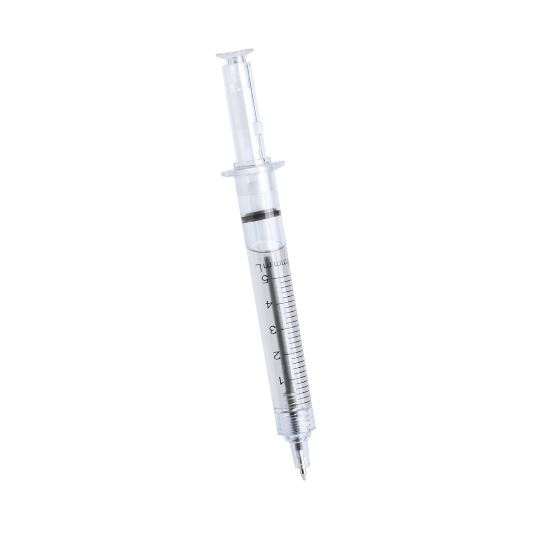 Original bolígrafo con diseño de jeringuilla y cuerpo transparente. Con líquido interior en vivos colores y de tinta azul.