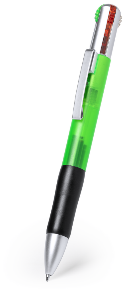 Bolígrafo 4 en 1 de mecanismo pulsador retráctil, de clásico diseño y cuerpo de suave acabado translúcido en vivos colores. Con accesorios en plateado y suave empuñadura ergonómica en color negro. De 4 cartuchos en tintas azul, roja, negra y verde. Escritura 4 Colores