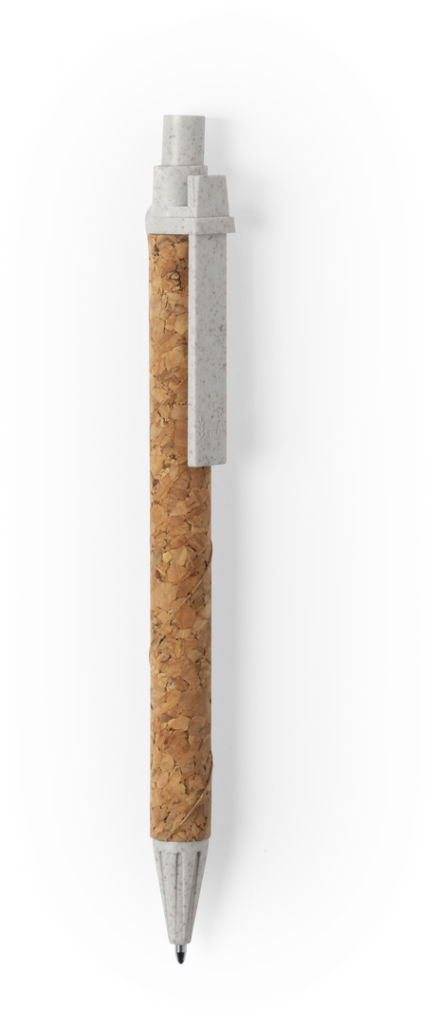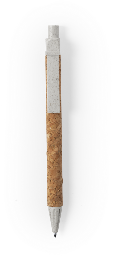 Bolígrafo con mecanismo pulsador de línea nature. Cuerpo en corcho natural, con accesorios en caña de trigo, para así fomentar la utilización de materias primas naturales y reducir las emisiones contaminantes. En tinta azul.