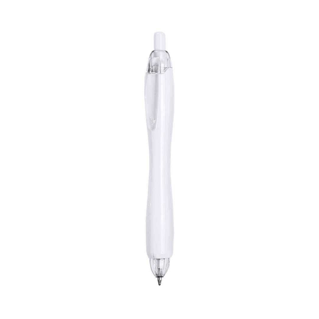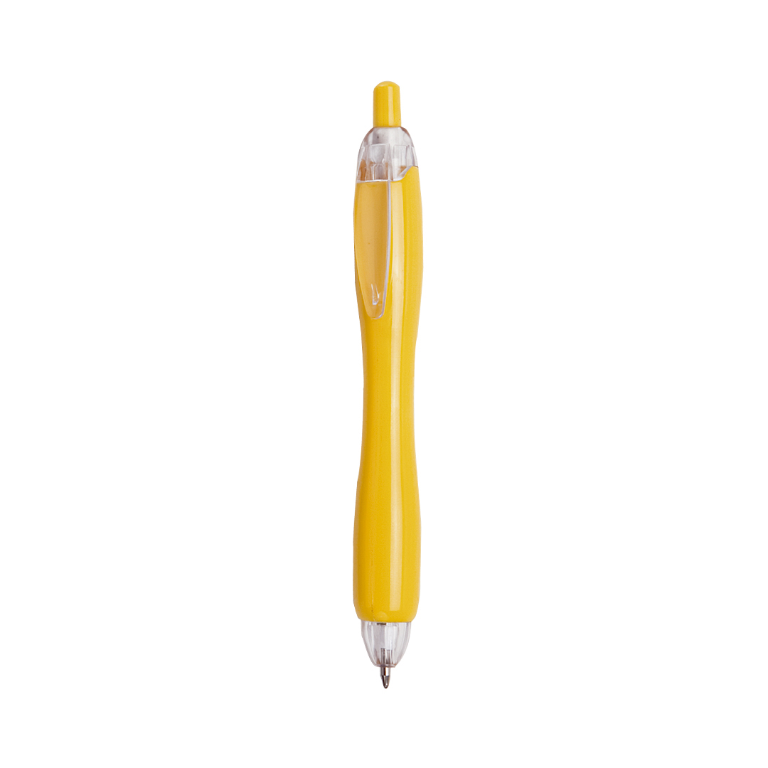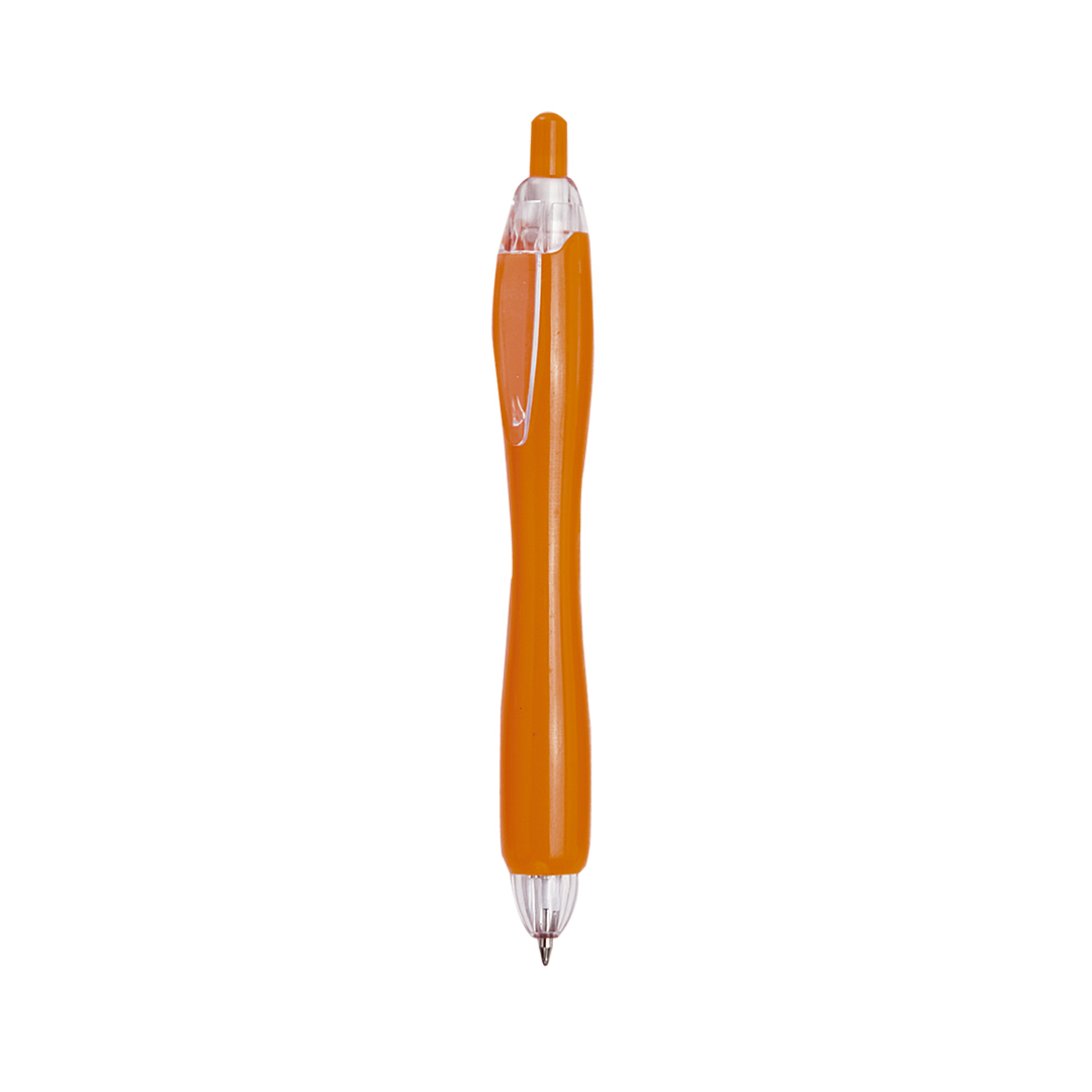 Bolígrafo de mecanismo pulsador de atrevido diseño bicolor con accesorios en colores transparentes y cuerpo curvado de suave acabado en llamativos colores sólidos. Con original clip transparente a juego. De cartucho jumbo y tinta azul. Carga Jumbo