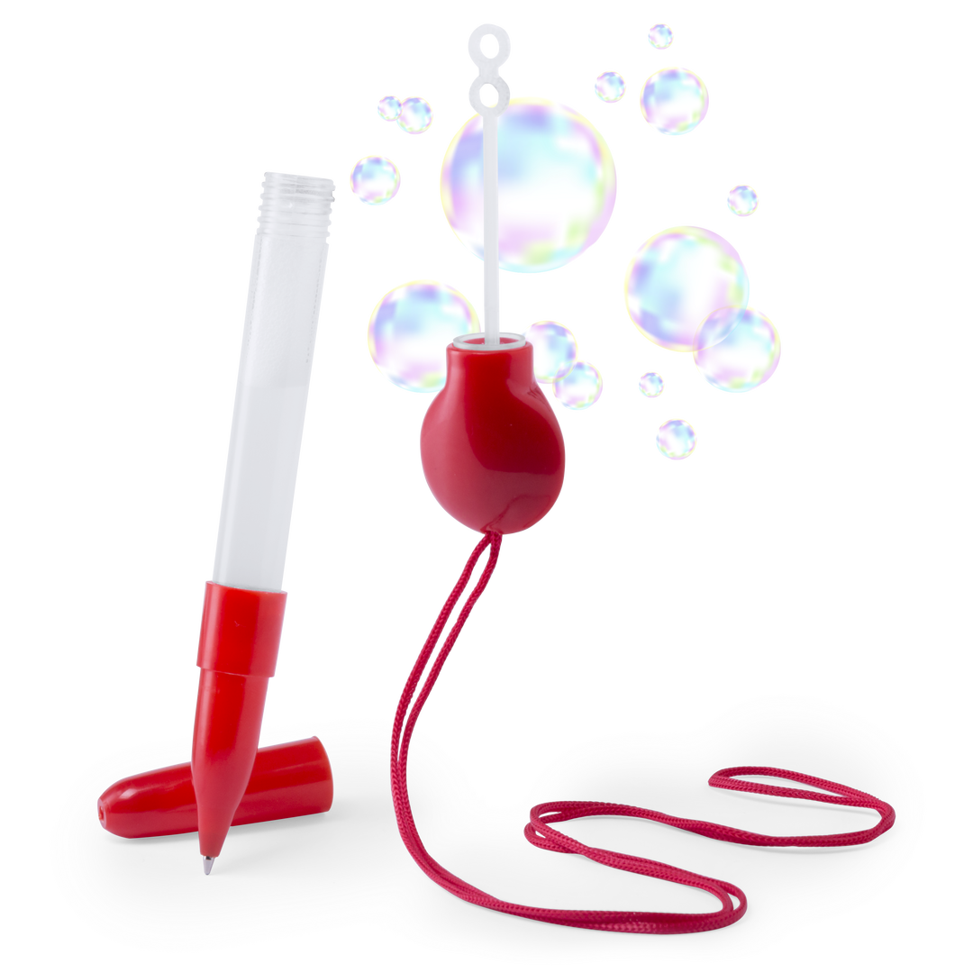 Divertido bolígrafo para hacer pompas de jabón en divertidos colores. Con lanyard y capucha a juego. Tinta azul. Líquido no incluido. Rellenable. Líquido No Incluido
