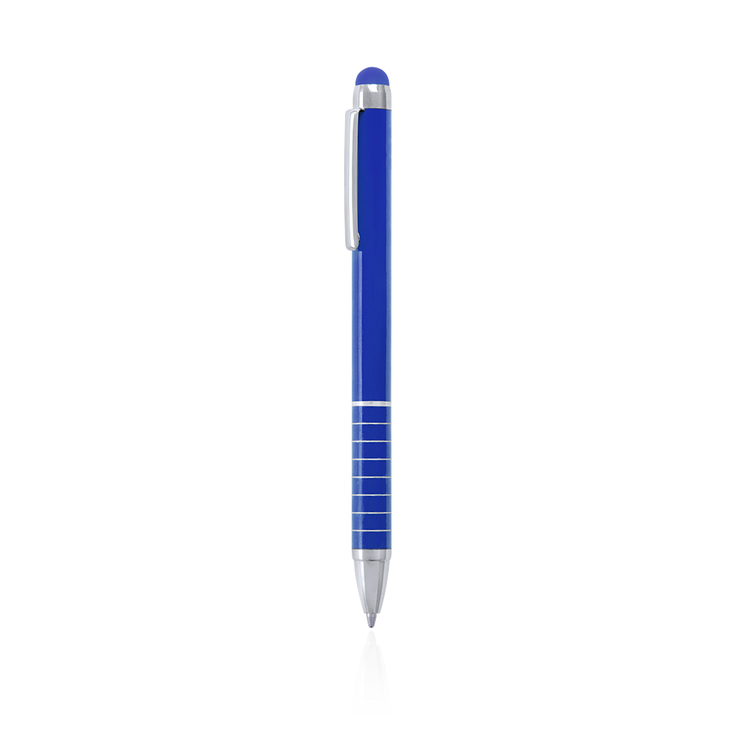 Bolígrafo puntero de mecanismo giratorio con cuerpo en aluminio de suave acabado metalizado en vivos colores. Accesorios y anillas en color plateado. Original empuñadura anillada, puntero a juego y tinta azul.