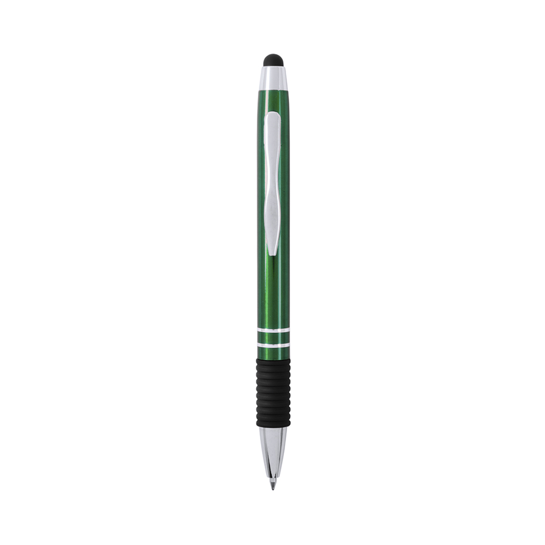 VerdeBolígrafo puntero de mecanismo giratorio con cuerpo en aluminio de suave acabado metalizado en variados colores. Accesorios y anillas en color plateado. Cómoda empuñadura de diseño en fuelle y tinta azul.
