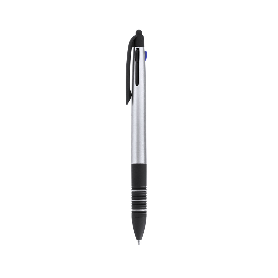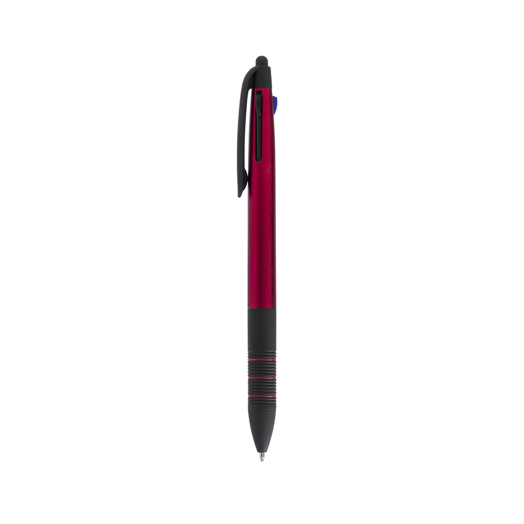 Bolígrafo puntero 3 en 1 de mecanismo pulsador retráctil, de actual diseño y cuerpo de suave acabado metalizado en vivos colores. Con accesorios en negro y suave empuñadura ergonómica en color negro con anillas a juego. De 3 cartuchos en tintas azul, roja Escritura 3 Colores