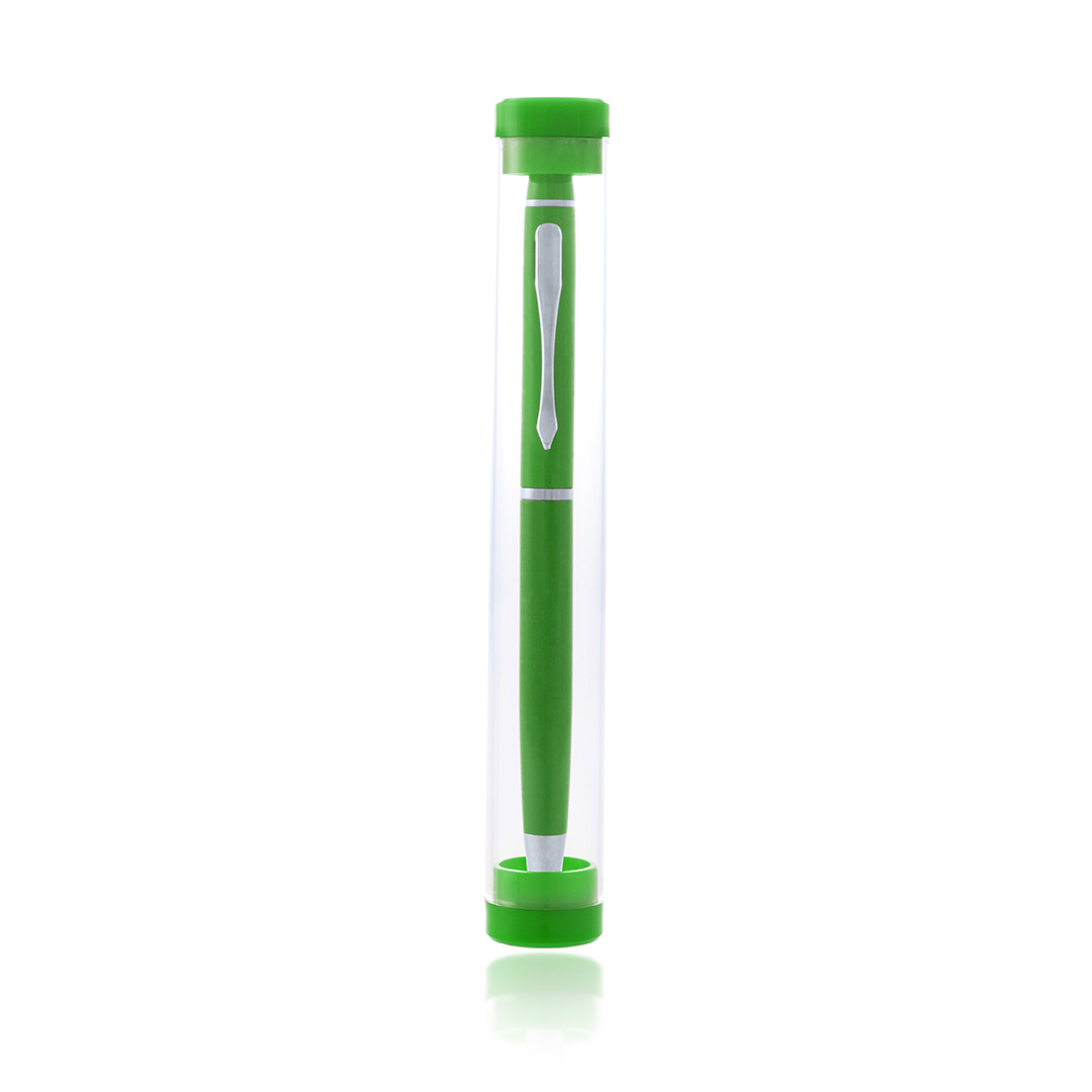 VerdeBolígrafo puntero de mecanismo giratorio con cuerpo en aluminio de suave acabado metalizado en variados colores. Accesorios y anillas en color plateado, con puntero a juego. Presentado en original estuche transparente a juego. Tinta azul.