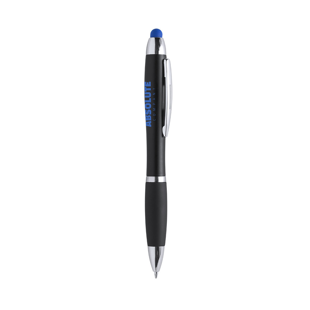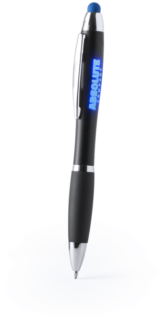 Bolígrafo puntero led de mecanismo giratorio con interior iluminado con luz en variados colores, cuerpo de acabado sólido en color negro y puntero a juego con el color de la luz led. Disponible con luz led en color amarillo, azul, blanco, naranja, rojo o 1 Led. Pilas Botón Incluidas