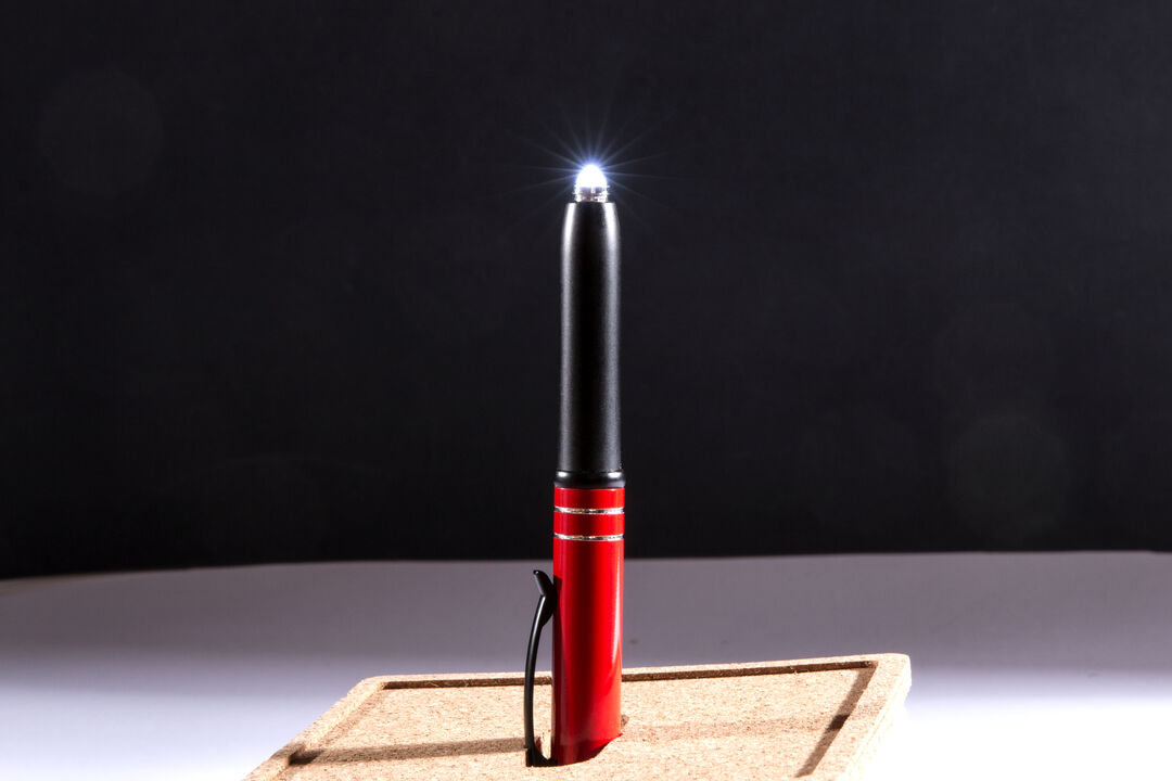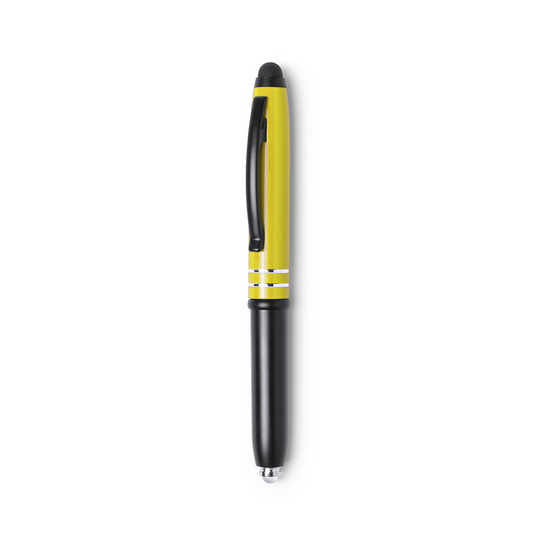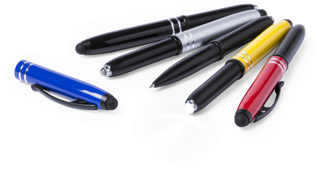 Bolígrafo puntero con capucha de aluminio en vivos colores, de elegante diseño bicolor y cuerpo de suave acabado metalizado. Accesorios y anillas en color negro, con linterna integrada. Pilas de botón incluidas con protector y tinta azul. 1 Led. Pilas Botón Incluidas