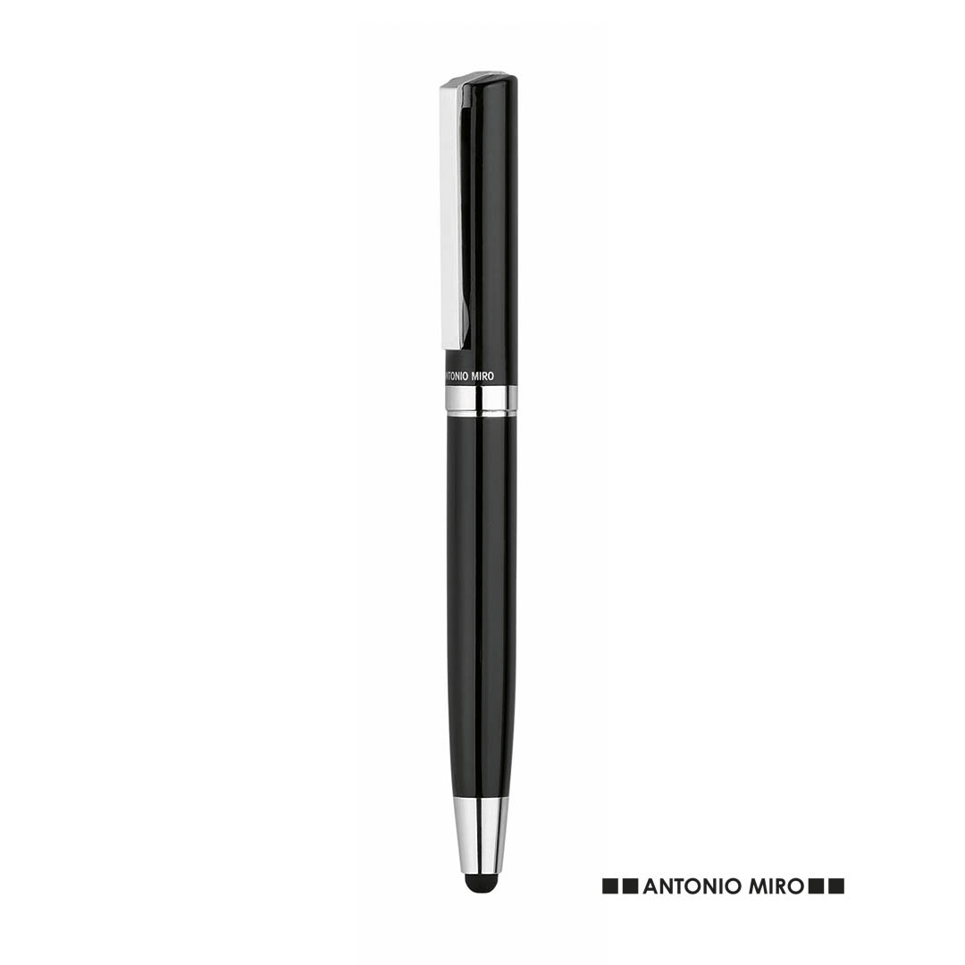 Bolígrafo puntero de Antonio Miró de mecanismo giratorio con suave cuerpo metálico, de elegante color negro. Clip de diseño y punta a juego. Presentado en estuche individual negro con logotipo de la marca. Tinta azul. Carga Jumbo
