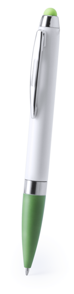 Bolígrafo puntero de colorido diseño, con cuerpo en elegante color blanco sólido. Empuñadura y puntero a juego, con detalles cromados. Tinta azul.