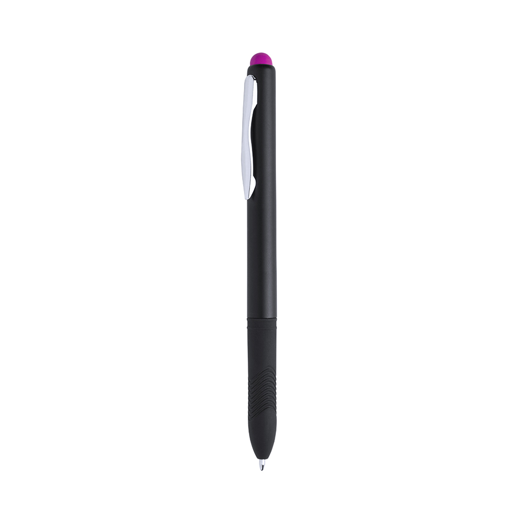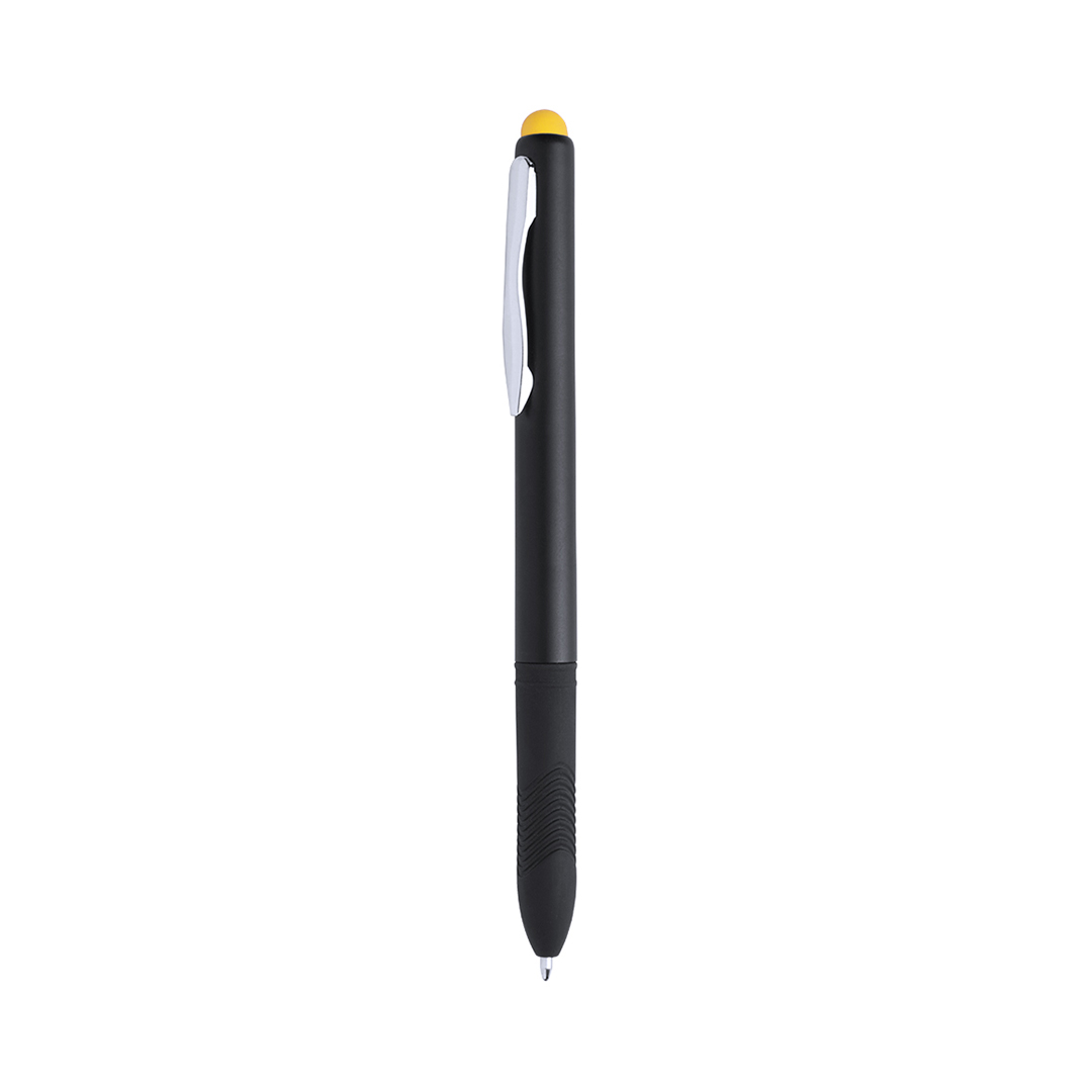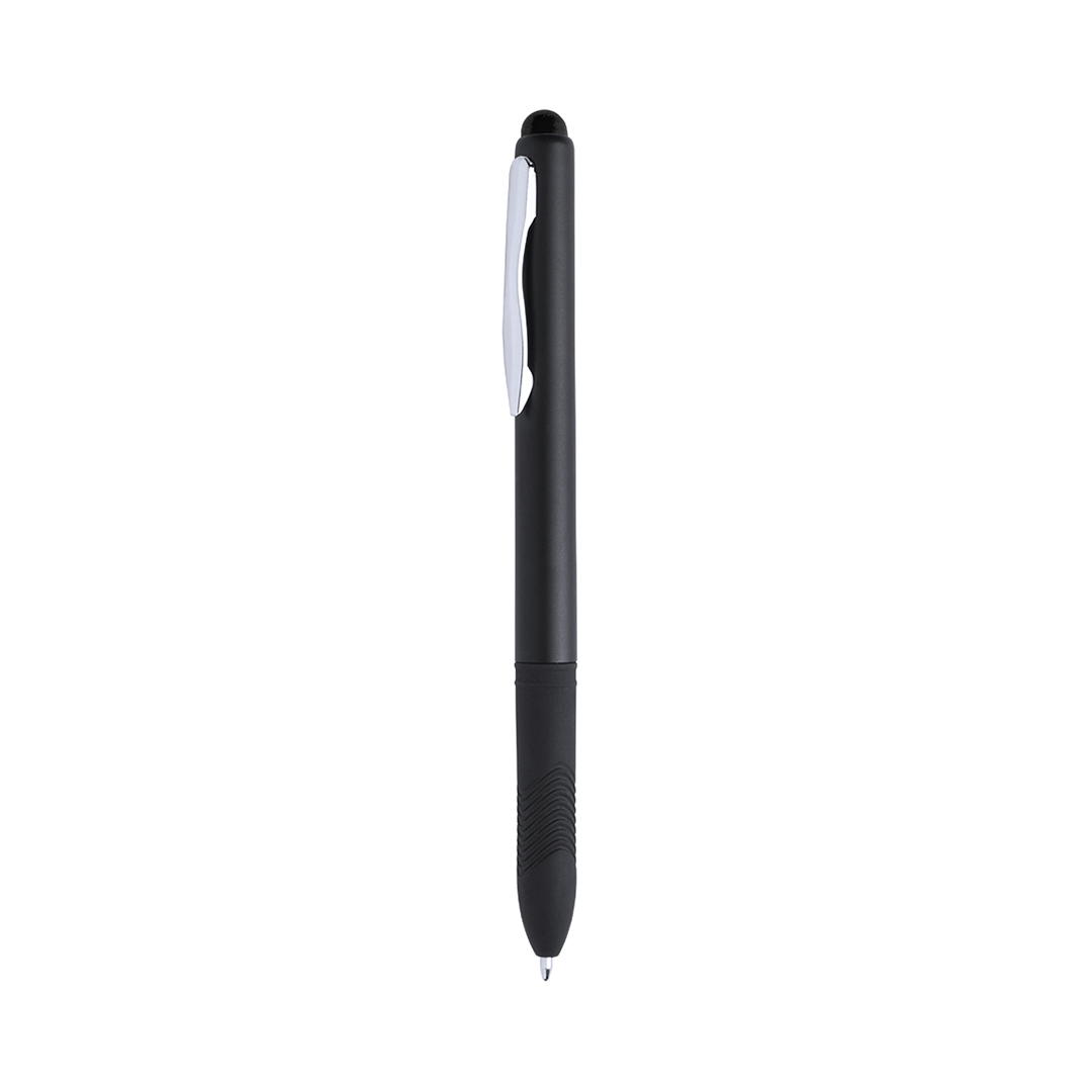 Bolígrafo puntero de mecanismo giratorio de elegante diseño bicolor con accesorios en color plateado brillante y cuerpo de suave acabado sólido en color negro. Con clip metálico y suave y cómoda empuñadura de original diseño. Puntero a juego en vivos colo Tinta Negra