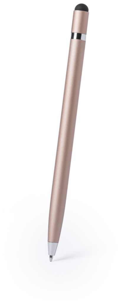 Bolígrafo puntero de mecanismo giratorio con cuerpo en aluminio de suave acabado metalizado. Con anilla cromada. Colores dorado, rosa, plateado y grafito con acabado brillo y color blanco con acabado mate. Tinta azul.