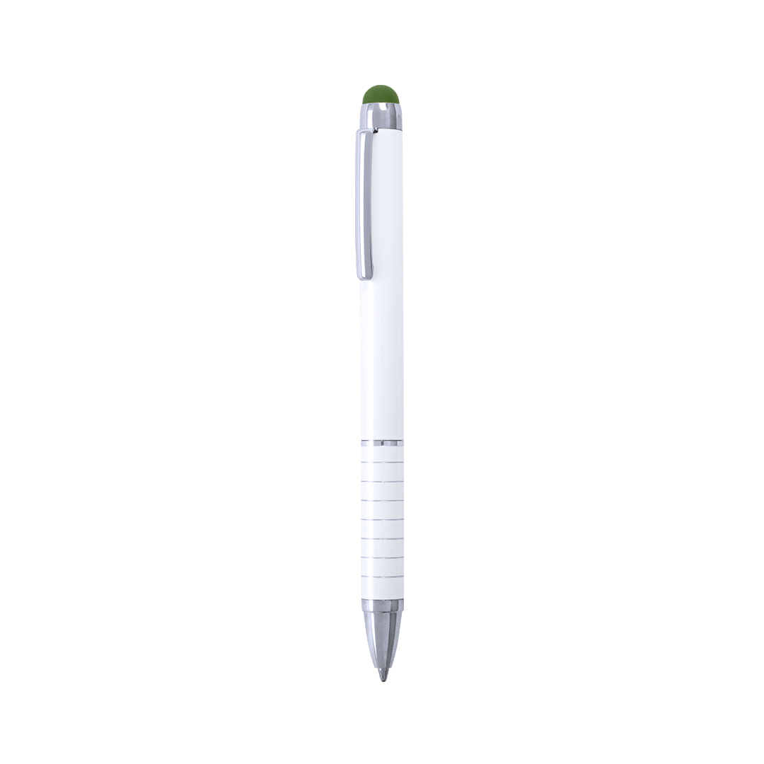 VerdeBolígrafo puntero de mecanismo giratorio con cuerpo en aluminio de suave acabado metalizado en elegante color blanco. Accesorios y anillas en color plateado. Puntero en variados colores, original empuñadura anillada y tinta azul.