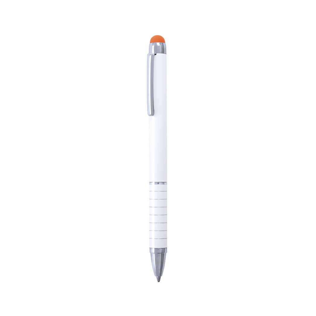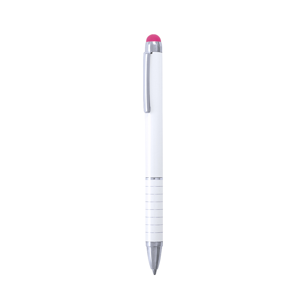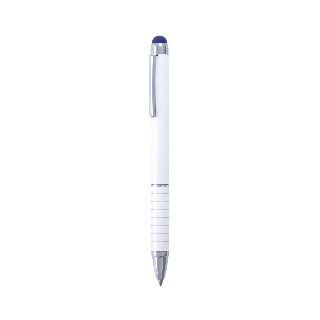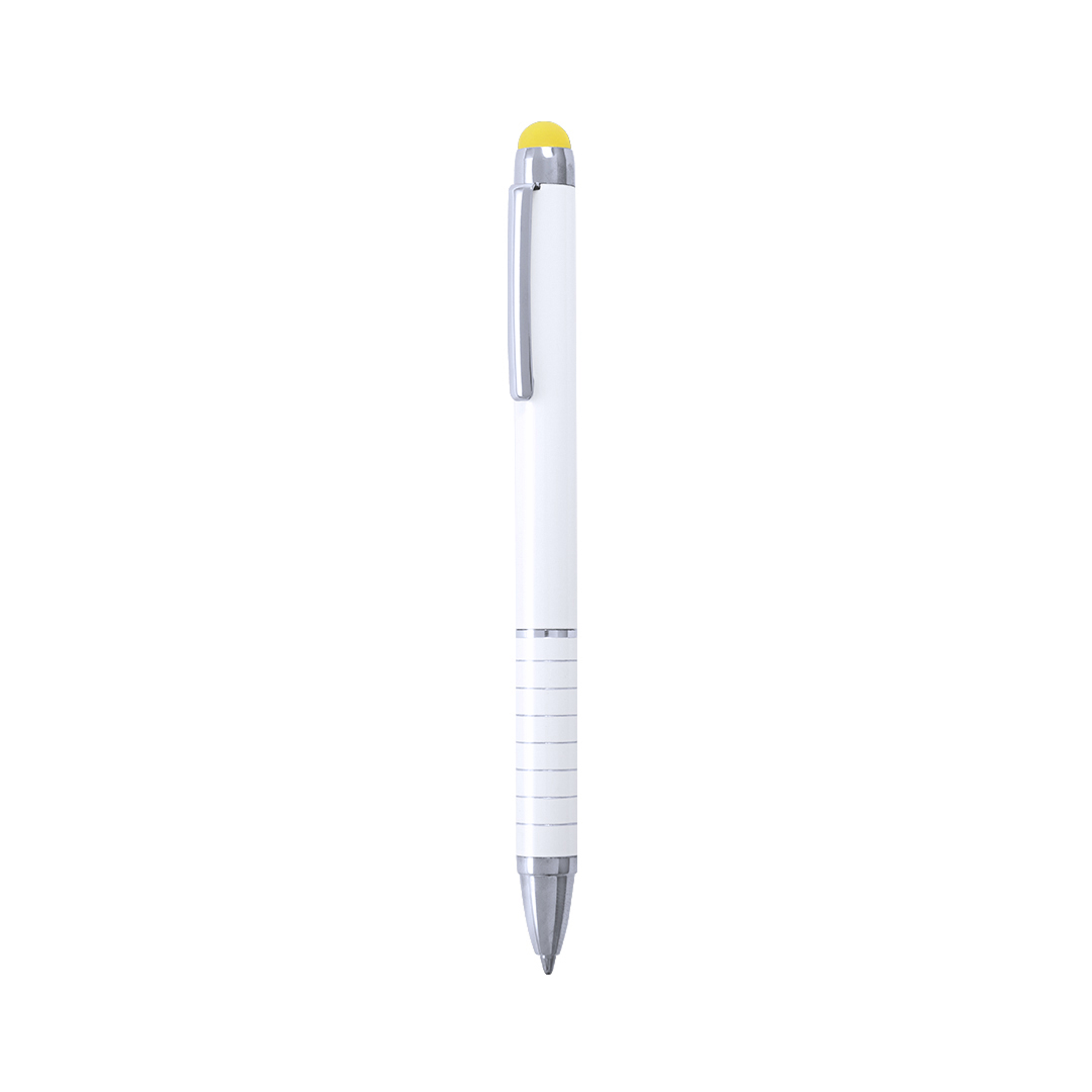 Bolígrafo puntero de mecanismo giratorio con cuerpo en aluminio de suave acabado metalizado en elegante color blanco. Accesorios y anillas en color plateado. Puntero en variados colores, original empuñadura anillada y tinta azul.