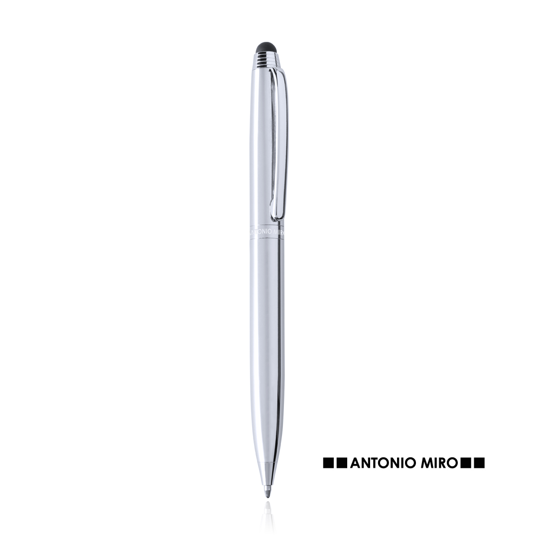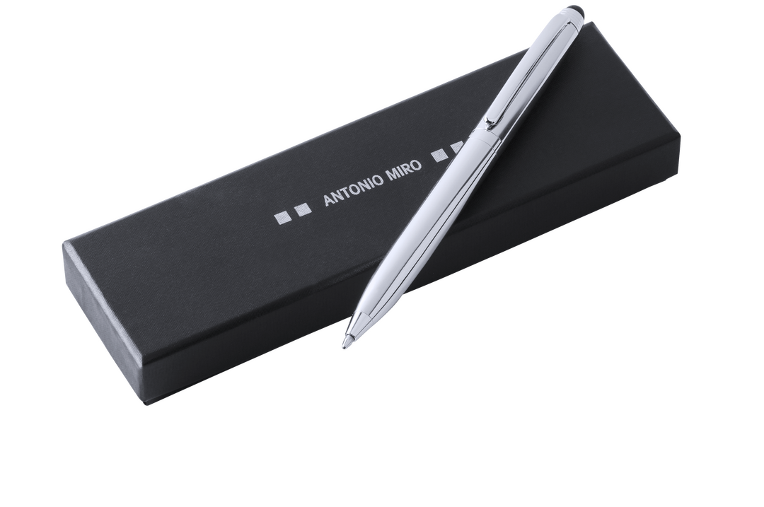Bolígrafo puntero de Antonio Miró de mecanismo giratorio con suave cuerpo metálico, de elegante color plateado. Clip de diseño a juego. Presentado en estuche individual negro con logotipo de la marca. Tinta azul. Carga Jumbo