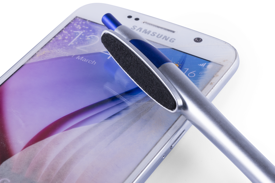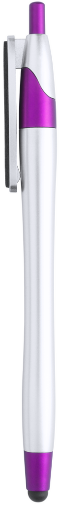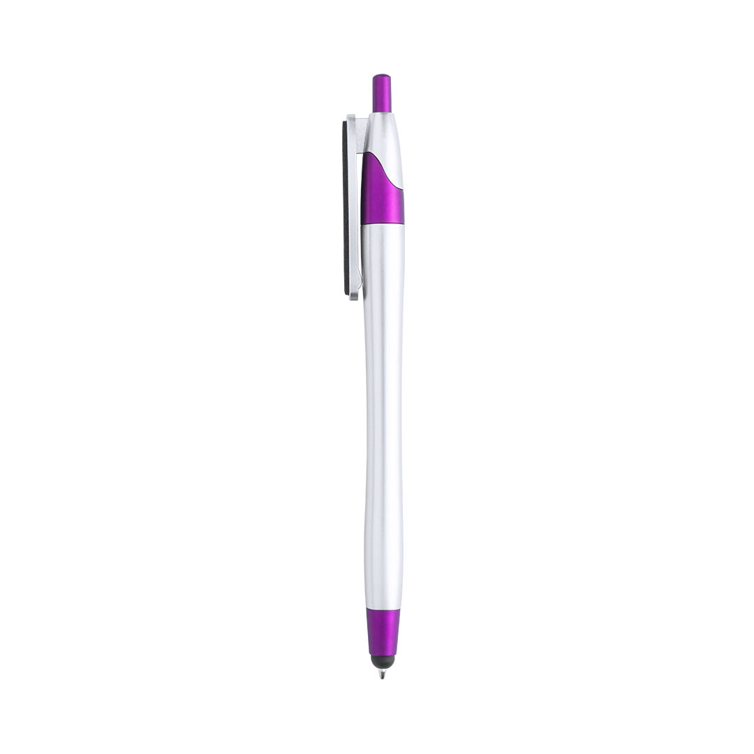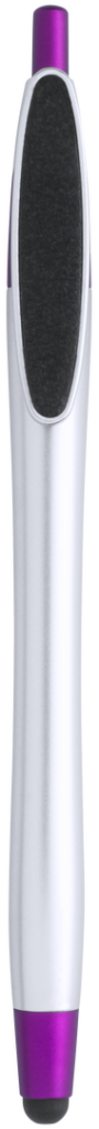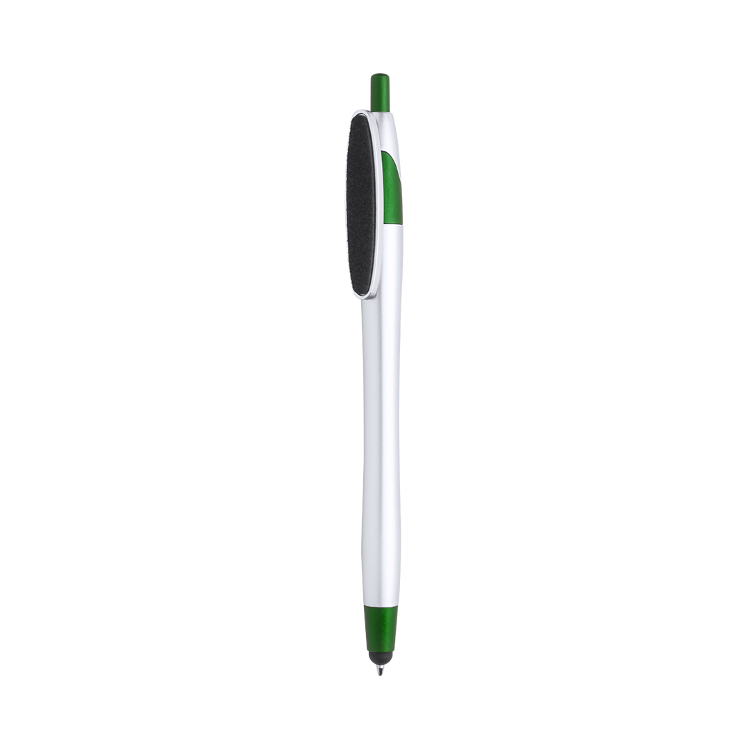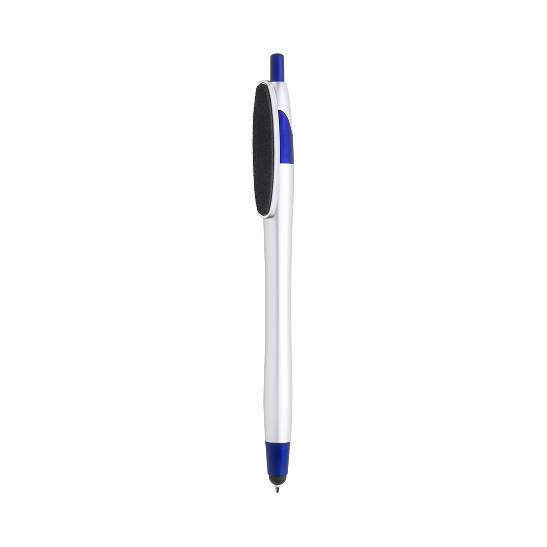 Bolígrafo puntero de mecanismo pulsador de atrevido diseño bicolor con accesorios en vivos colores y cuerpo curvado de suave acabado metalizado en color plateado. Original clip limpiador de pantalla integrado y tinta negra. Tinta Negra. Limpiapantallas Incluido