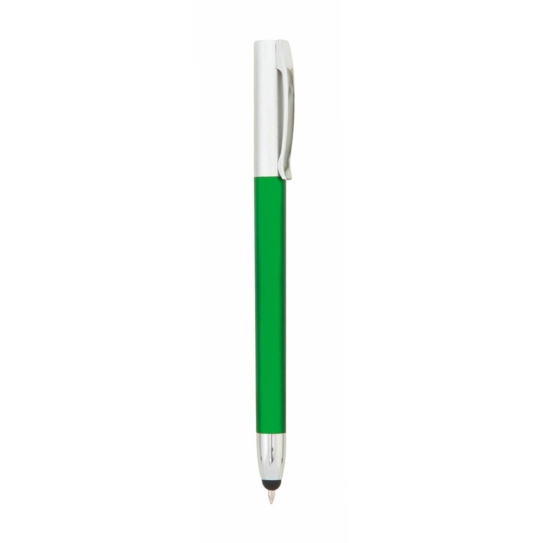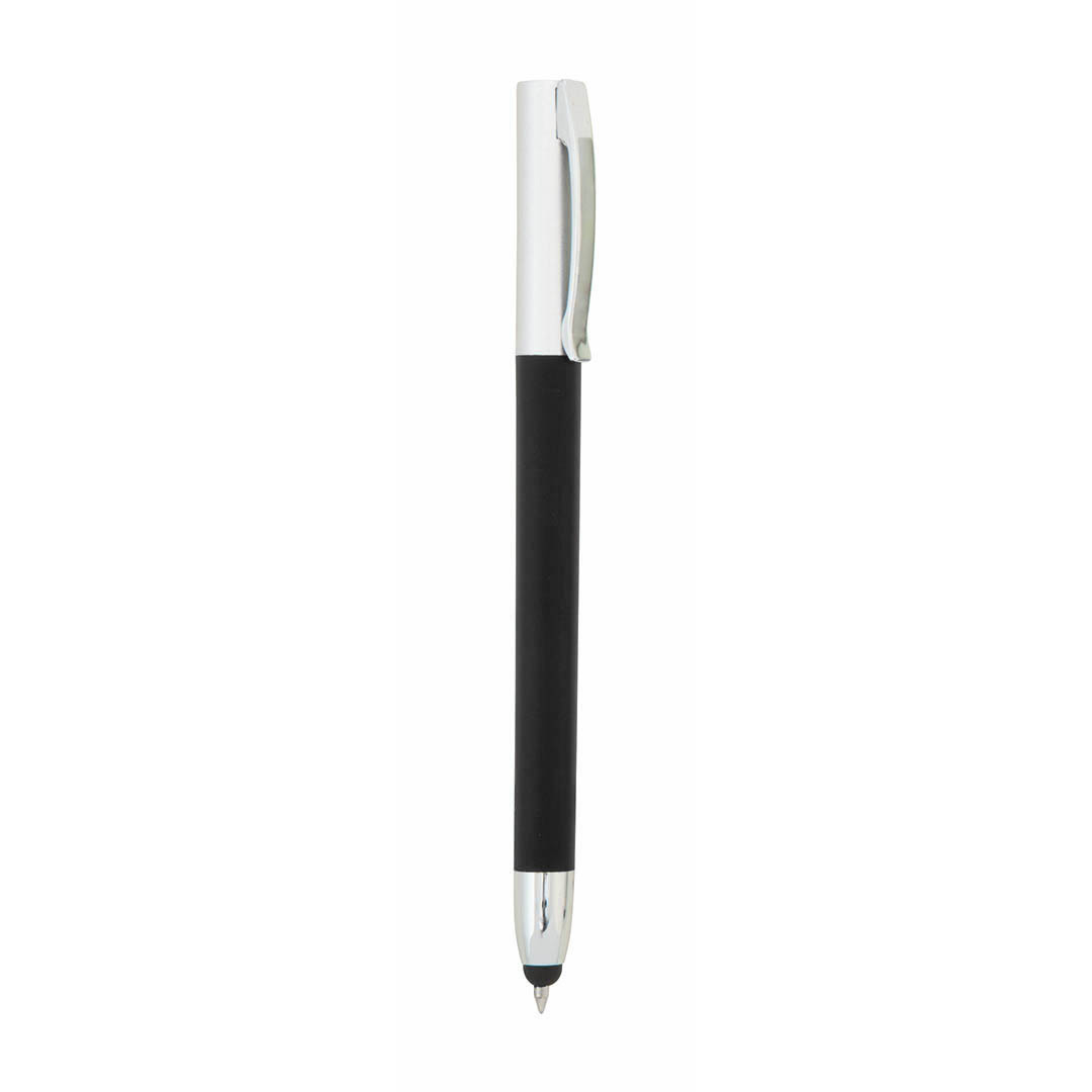 Bolígrafo puntero de mecanismo giratorio de sobrio diseño bicolor con accesorios en elegante color plateado y cuerpo de suave acabado de goma en negro. Clip metálico y tinta azul.
