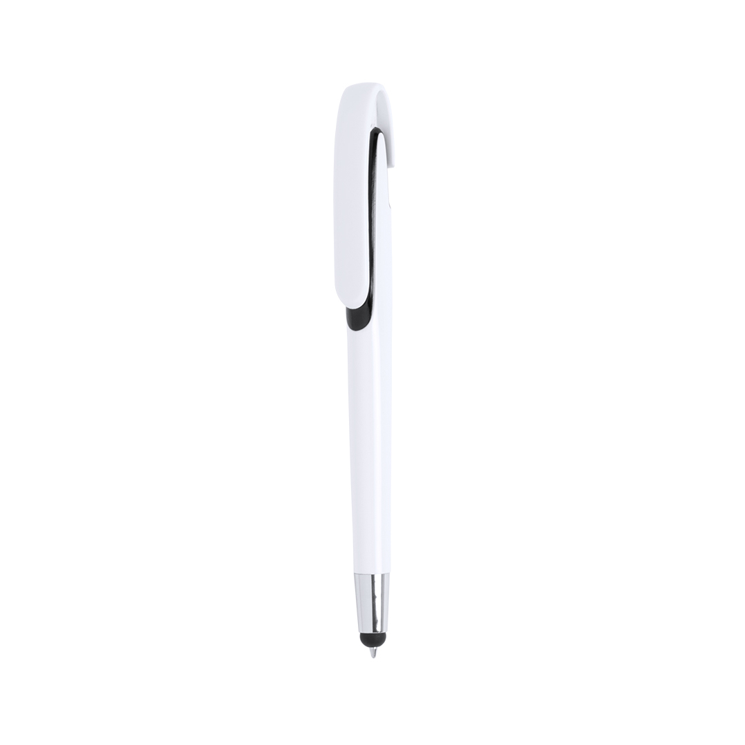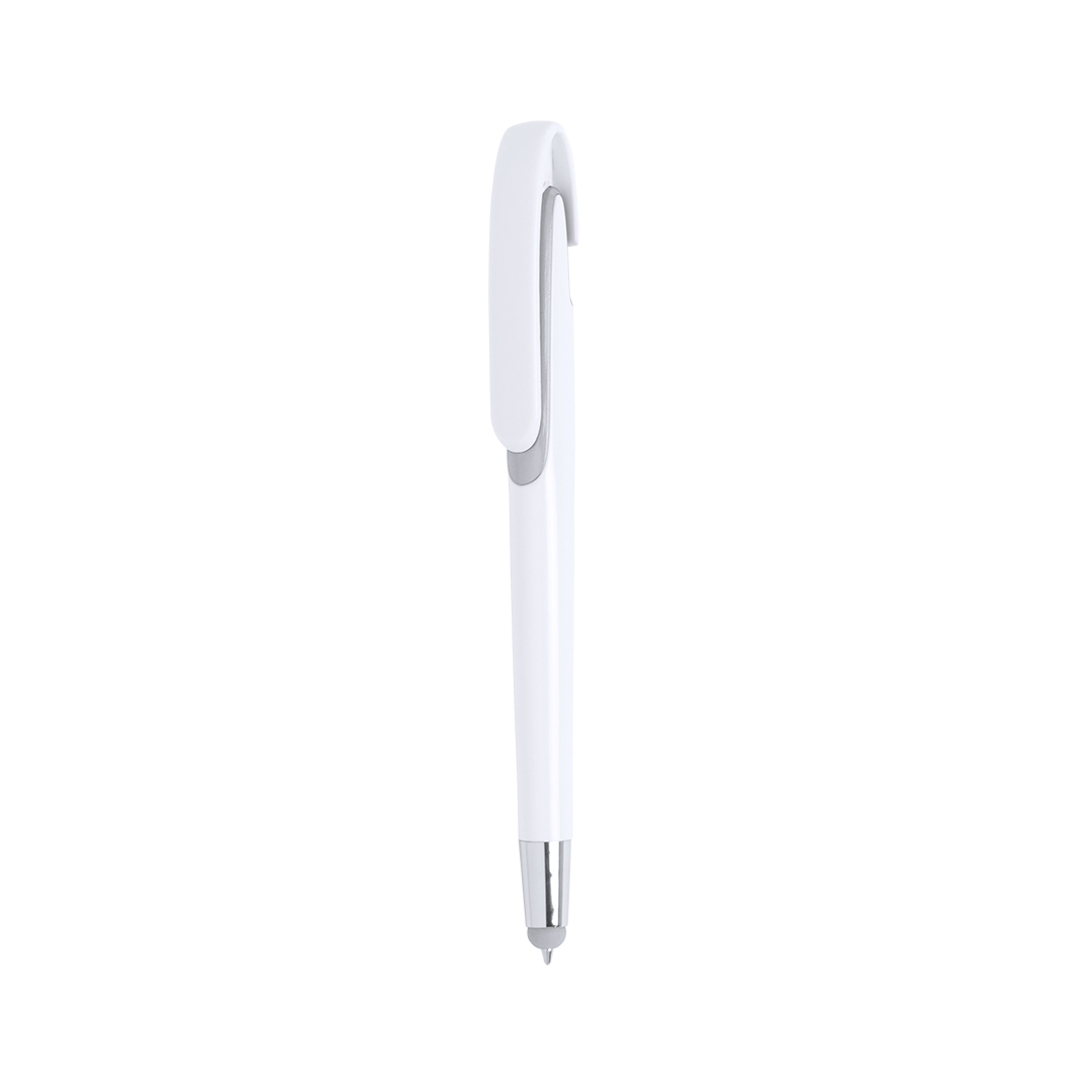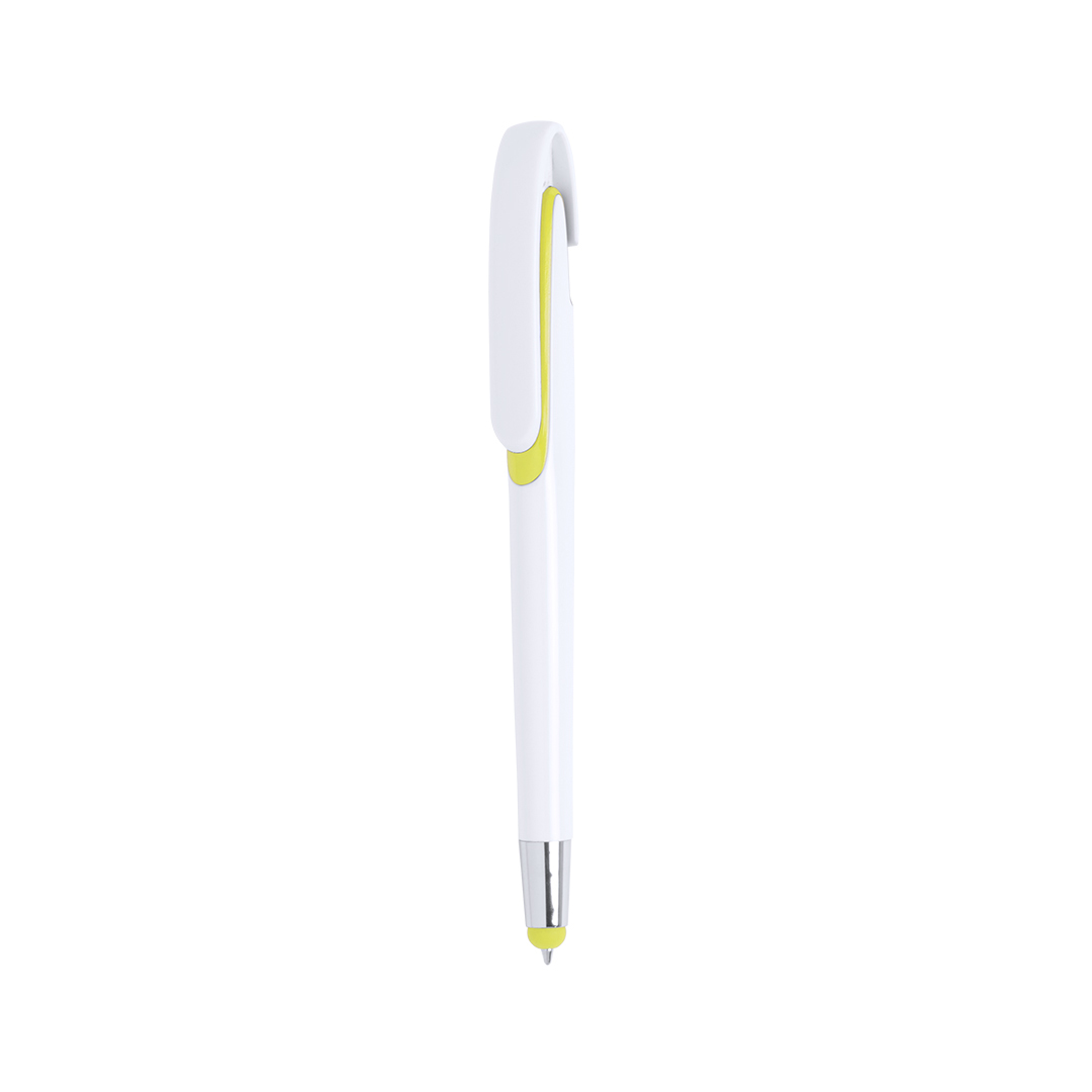 Bolígrafo puntero de mecanismo pulsador con cuerpo de acabado brillante en color blanco y accesorios en variada gama de vivos colores. Con clip maxi y tinta azul.