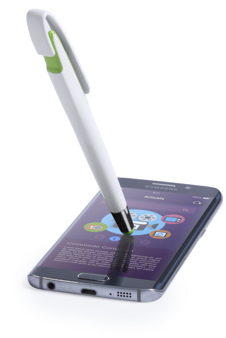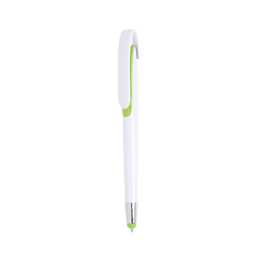 Verde ClaroBolígrafo puntero de mecanismo pulsador con cuerpo de acabado brillante en color blanco y accesorios en variada gama de vivos colores. Con clip maxi y tinta azul.