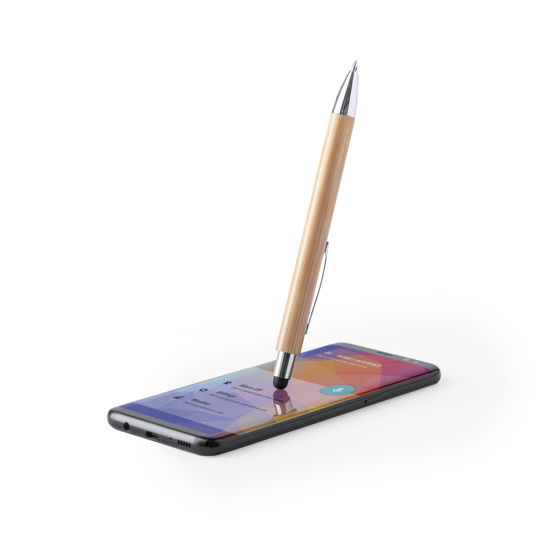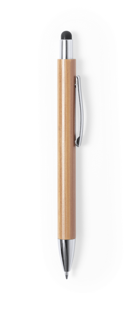 Bolígrafo puntero de línea nature, con cuerpo en bambú y accesorios cromados, con puntero en negro. De mecanismo pulsador, clip metálico y cartucho jumbo con tinta azul. Carga Jumbo