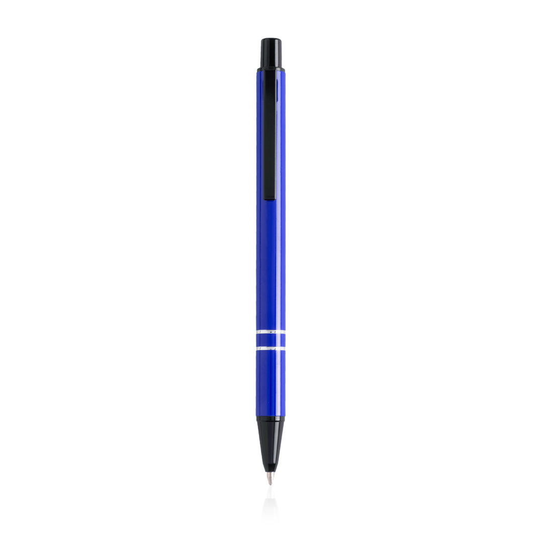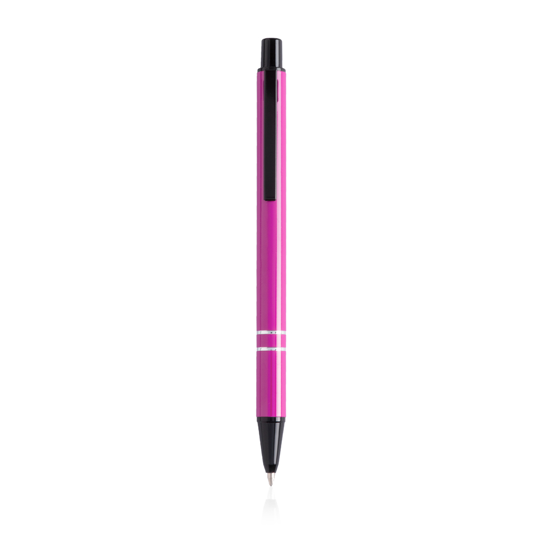 Bolígrafo de mecanismo pulsador en original diseño bicolor. Con cuerpo en aluminio de suave acabado en alegres colores. Accesorios en color negro y anillas en plateado. Tinta azul.