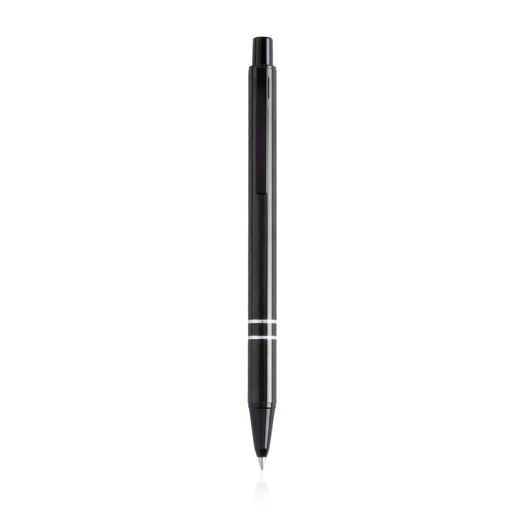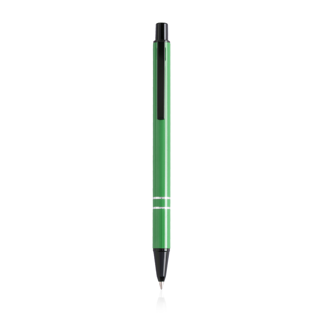 VerdeBolígrafo de mecanismo pulsador en original diseño bicolor. Con cuerpo en aluminio de suave acabado en alegres colores. Accesorios en color negro y anillas en plateado. Tinta azul.
