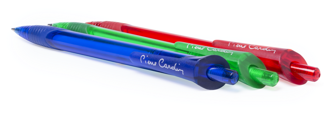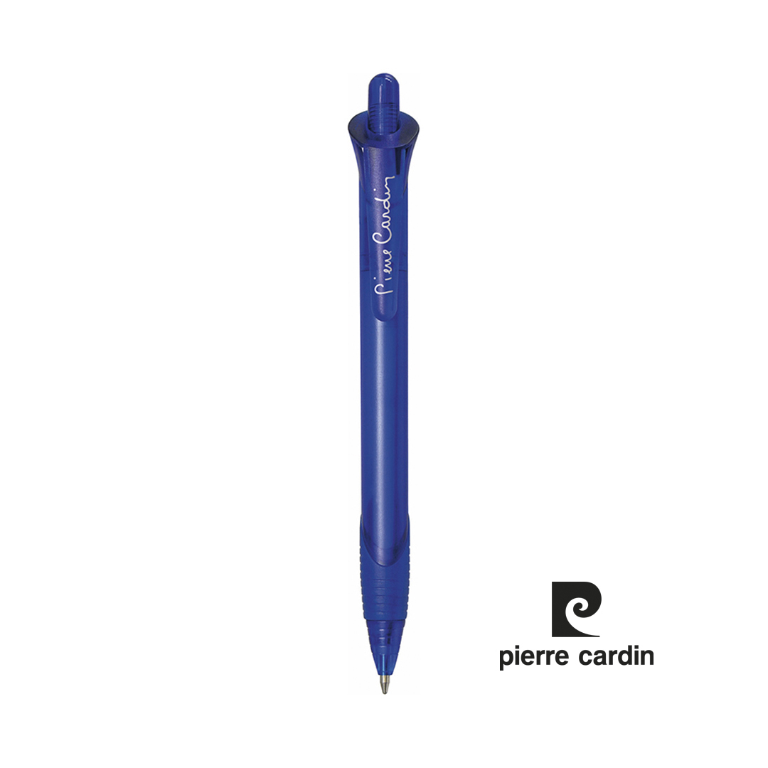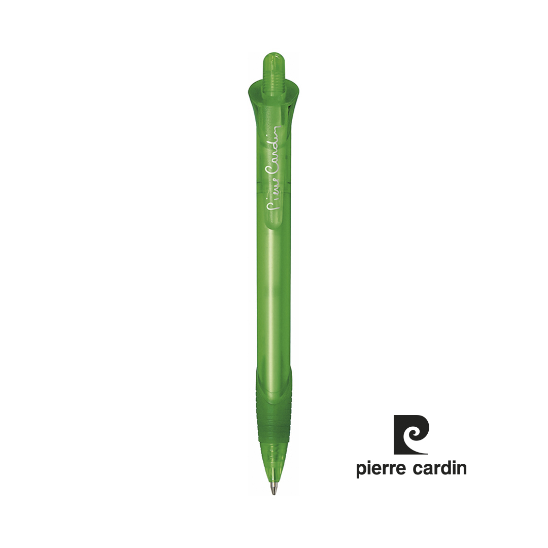 Bolígrafo de Pierre Cardin de mecanismo pulsador de original diseño y suave cuerpo de acabado translúcido en vivos colores. Con accesorios a juego y logotipo de la marca en el clip. Cómoda empuñadura de goma, de cartucho jumbo y tinta azul. Carga Jumbo