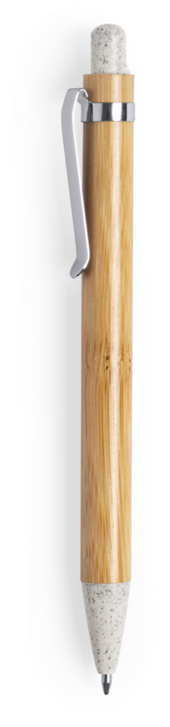 Bolígrafo con mecanismo pulsador de línea nature. Cuerpo en bambú, con pulsador y punta en caña de trigo, para así fomentar la utilización de materias primas naturales y reducir las emisiones contaminantes. Con original clip metálico, de cartucho jumbo y Carga Jumbo