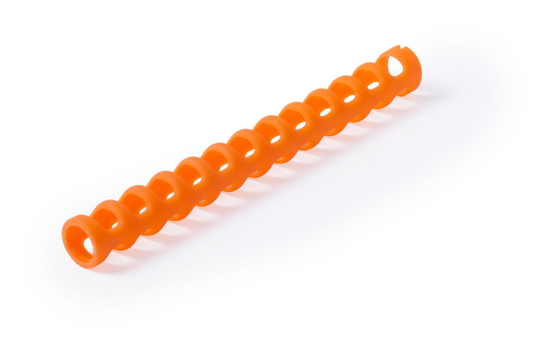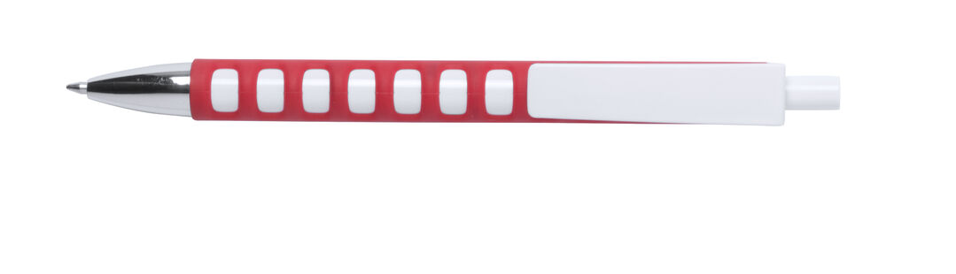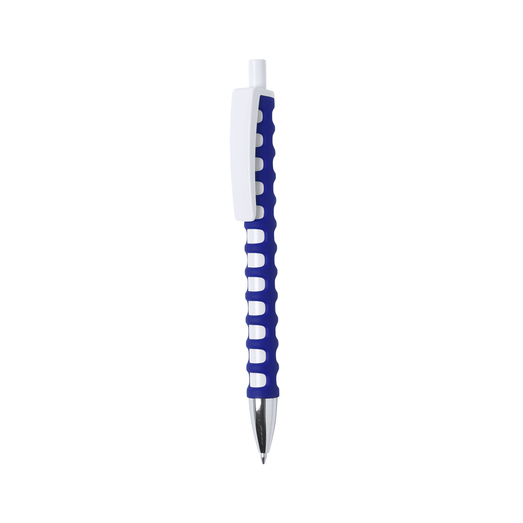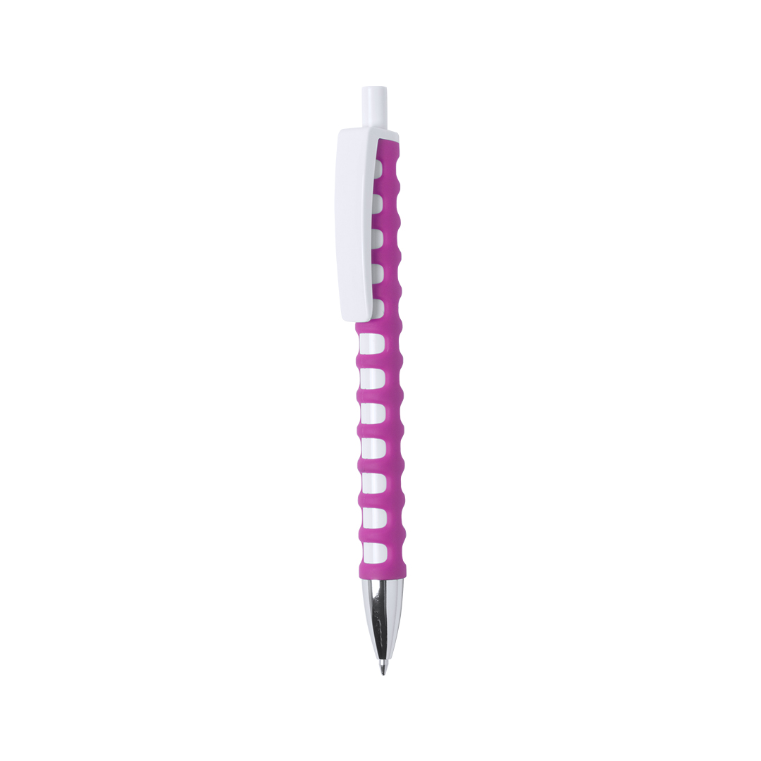 Bolígrafo de mecanismo pulsador de original diseño, con cuerpo troquelado de suave tacto goma en vivos colores. Con clip maxi en color blanco para marcaje y punta en color plateado brillante.