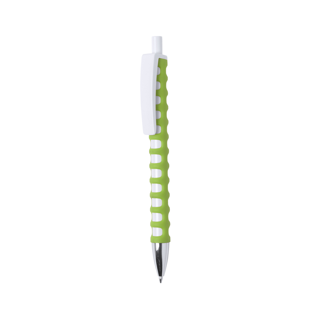 Verde ClaroBolígrafo de mecanismo pulsador de original diseño, con cuerpo troquelado de suave tacto goma en vivos colores. Con clip maxi en color blanco para marcaje y punta en color plateado brillante.