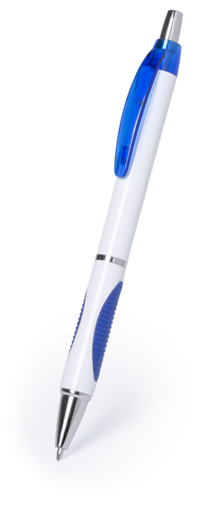 Bolígrafo de mecanismo pulsador de atrevido diseño bicolor con accesorios en colores translúcidos y cuerpo de suave acabado en color blanco sólido. Con original clip a juego. Tinta azul.