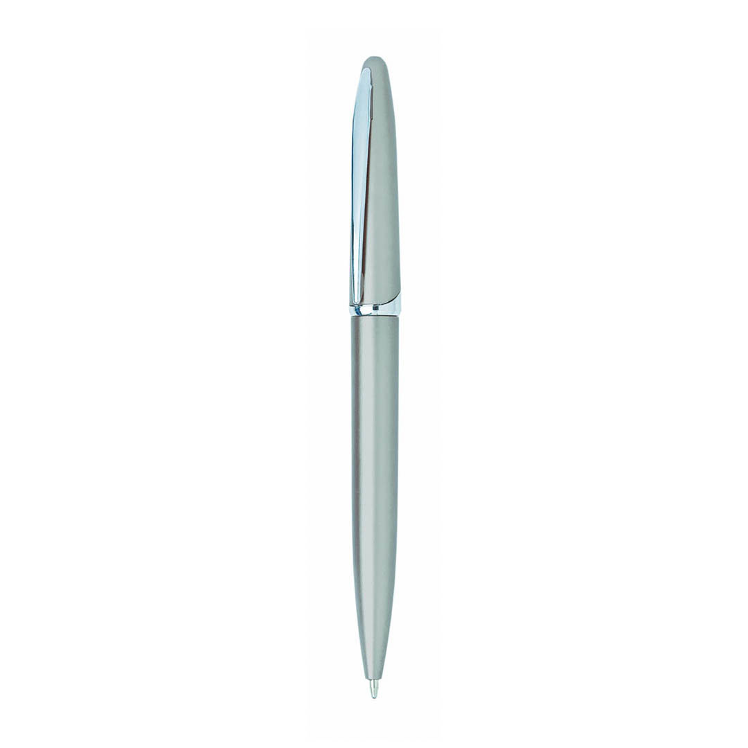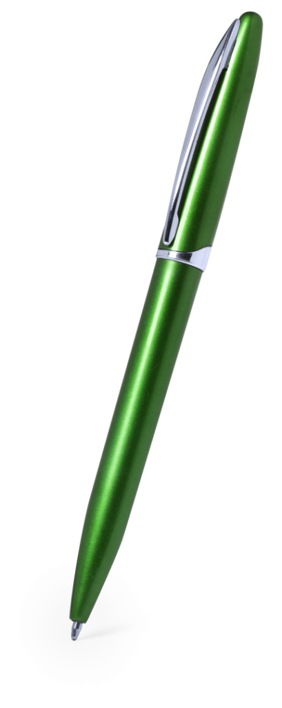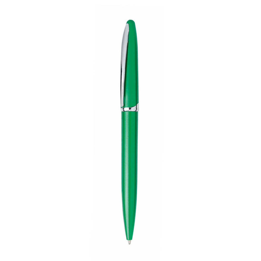 VerdeBolígrafo de mecanismo giratorio de elegante diseño bicolor con accesorios en color plateado brillante y cuerpo de suave acabado en llamativos colores brillantes. Con clip metálico y anilla a juego. Tinta azul.
