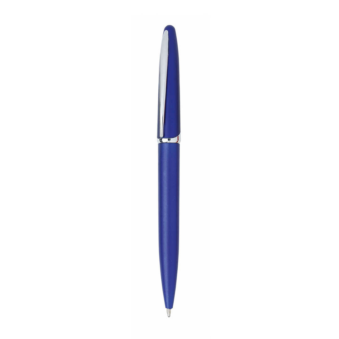 Bolígrafo de mecanismo giratorio de elegante diseño bicolor con accesorios en color plateado brillante y cuerpo de suave acabado en llamativos colores brillantes. Con clip metálico y anilla a juego. Tinta azul.