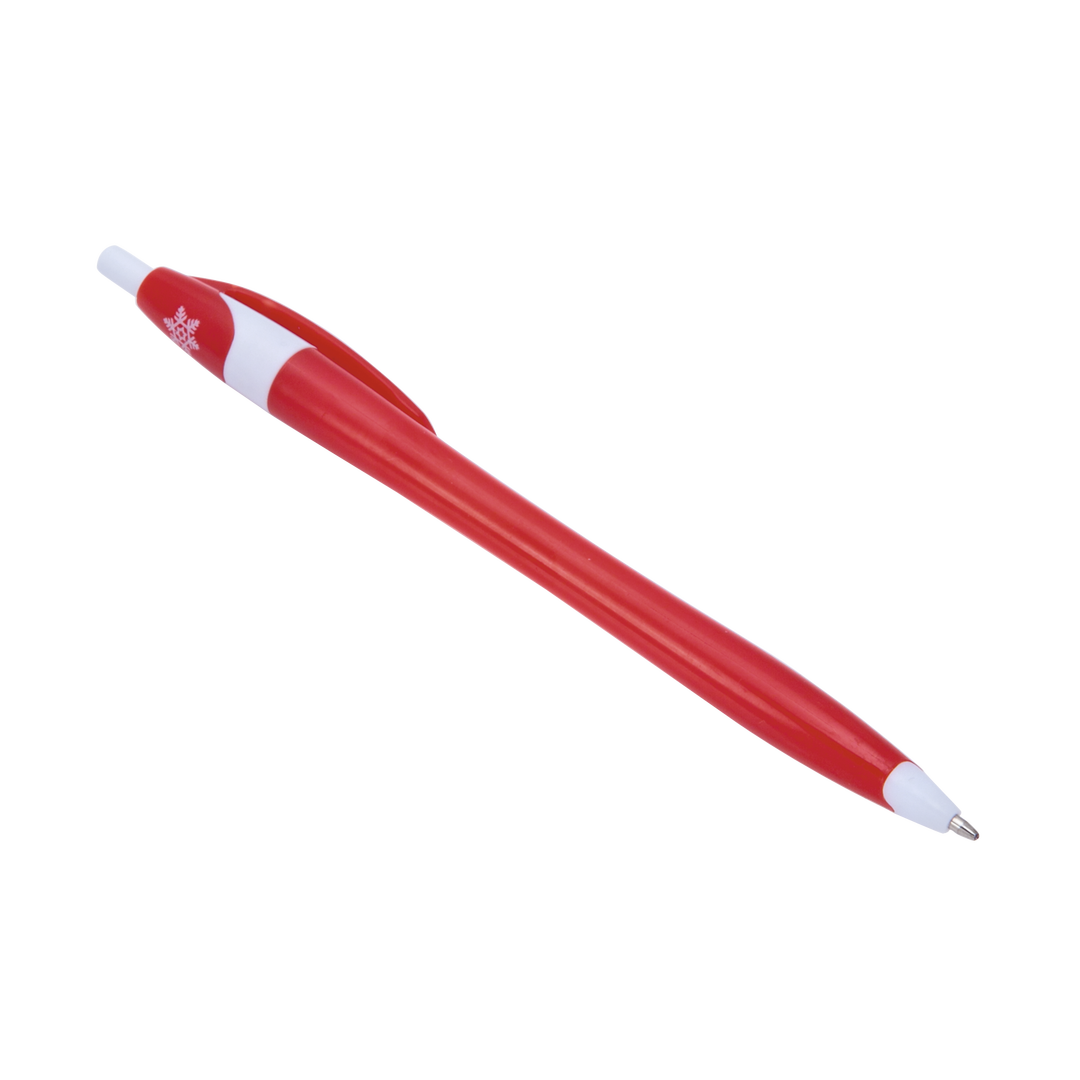 Bolígrafo de mecanismo pulsador de diseño bicolor navideño y cuerpo curvado de suave acabado. Con clip plano a juego y bola de nieve impresa en parte superior. Tinta azul.