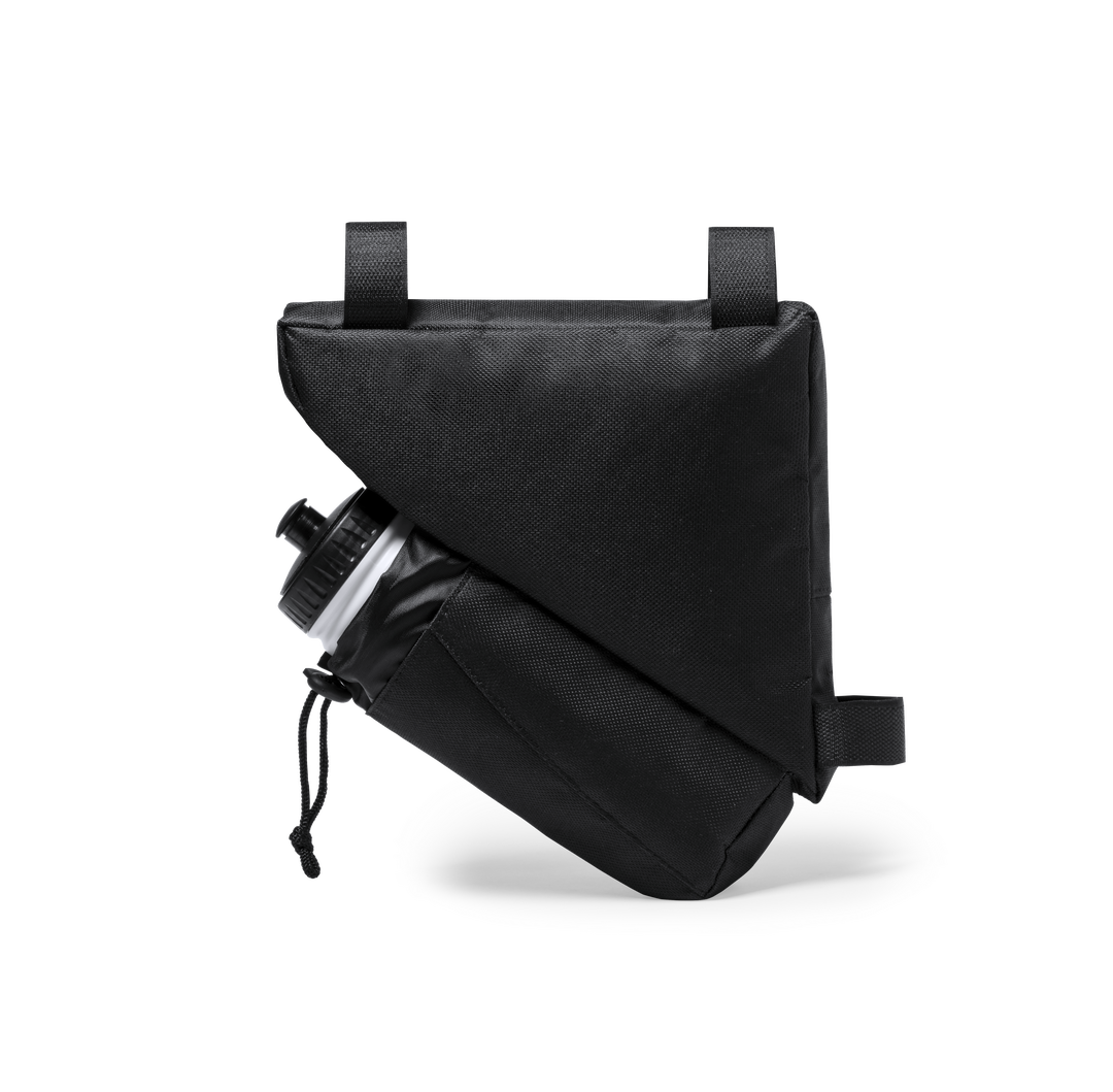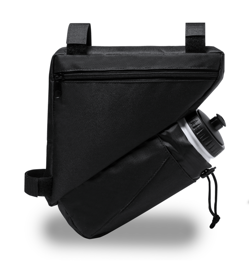 Bolsa para de bicicleta en resistente poliéster 600D con interior reforzado en PVC. Disponible en color negro. Compartimento principal con cierre de cremallera y ajuste universal al cuadro de la bicicleta mediante 3 tiras de velcro. Compartimento para bid