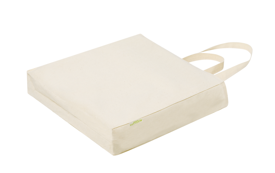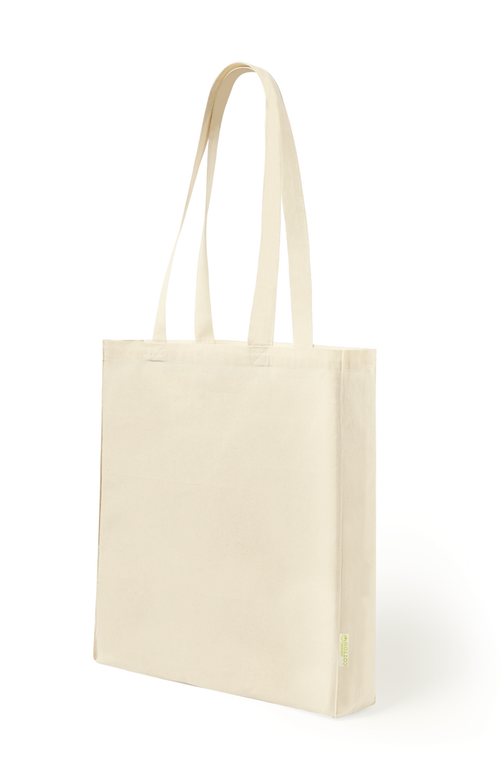 Bolsa de línea nature en algodón orgánico de 140g/m2. Asas largas en algodón orgánico, de 70 cm y reforzadas. Acabado cosido y resistencia de hasta 8kg de peso, con distintivo algodón orgánico en la etiqueta.