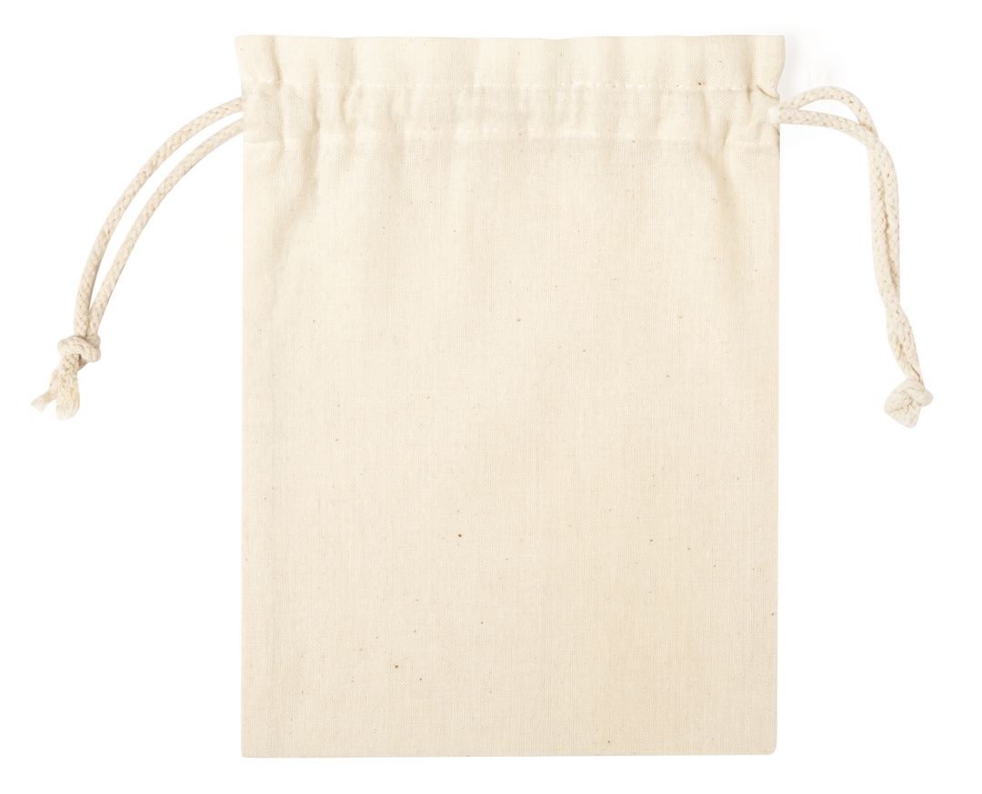 Bolsita de línea nature en material 100% algodón de 105g/m2. Tamaño 15×21 cm, de acabado cosido y con cordones autocierre de algodón.