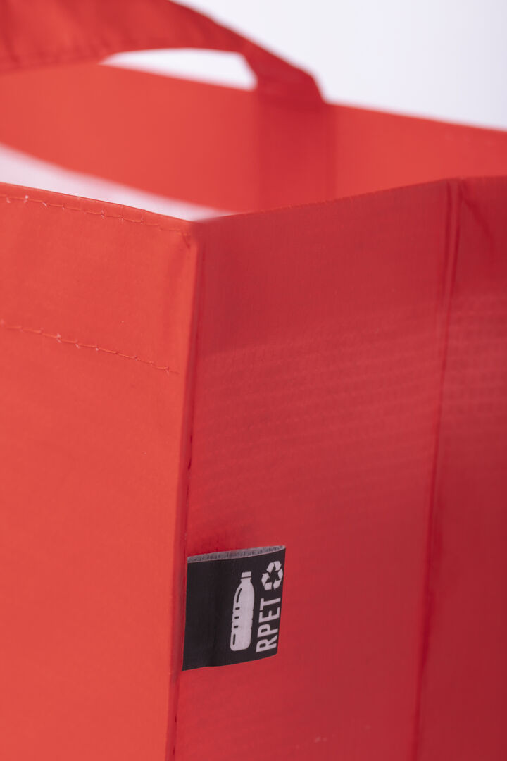 Bolsa de línea nature en material RPET, elaborado a partir de plástico reciclado, para así fomentar la reutilización de residuos plásticos y ayudar a la sostenibilidad del planeta. En material laminado de 100 g/m2 de acabado mate, con asas medianas y cost