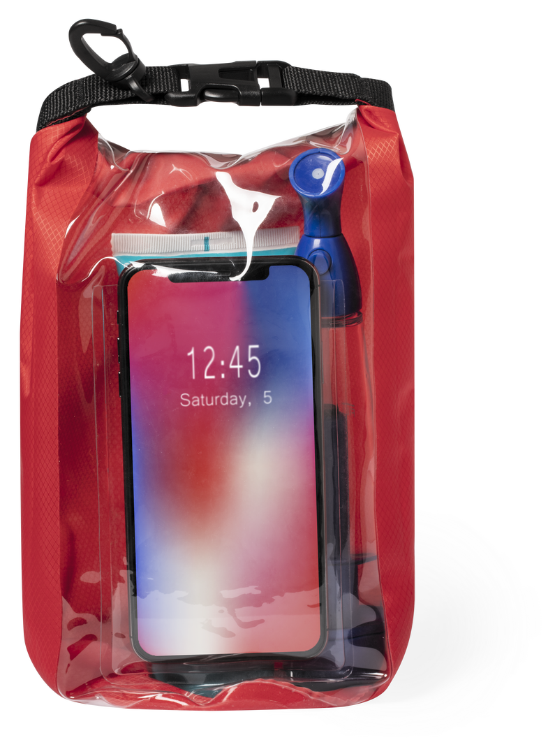 Bolsa impermeable en suave y resistente ripstop con cierre estanco de seguridad y 2l de capacidad. Ventana transparente en un lado de la bolsa con superficie táctil para usar smartphone. Asa con hebilla de cierre y mosquetón para transporte incluido. Disp Impermeable