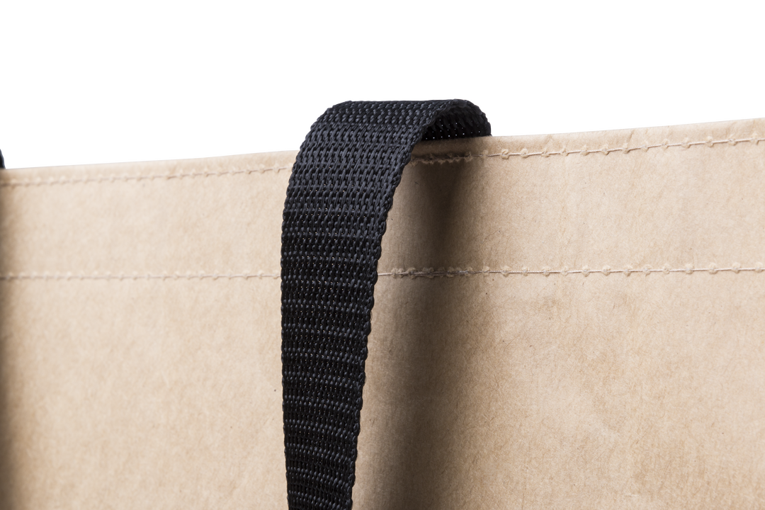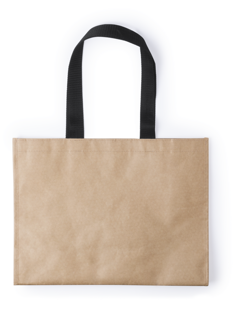 Bolsa ecológica en material KPP -combinación de papel y non-woven- de 140g/m2. De acabado cosido, con asas largas de 60 cm reforzadas en contraste negro. Resistencia hasta 7kg de peso.
