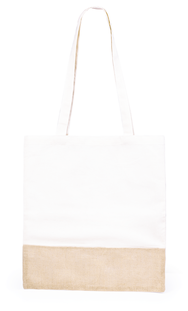 Bolsa ecológica en resistente combinación de materiales naturales -yute y algodón- de 245g/m2. Con atractivo diseño bicolor y acabado cosido. Asas largas de 70 cm reforzadas y resistencia hasta 8kg de peso.