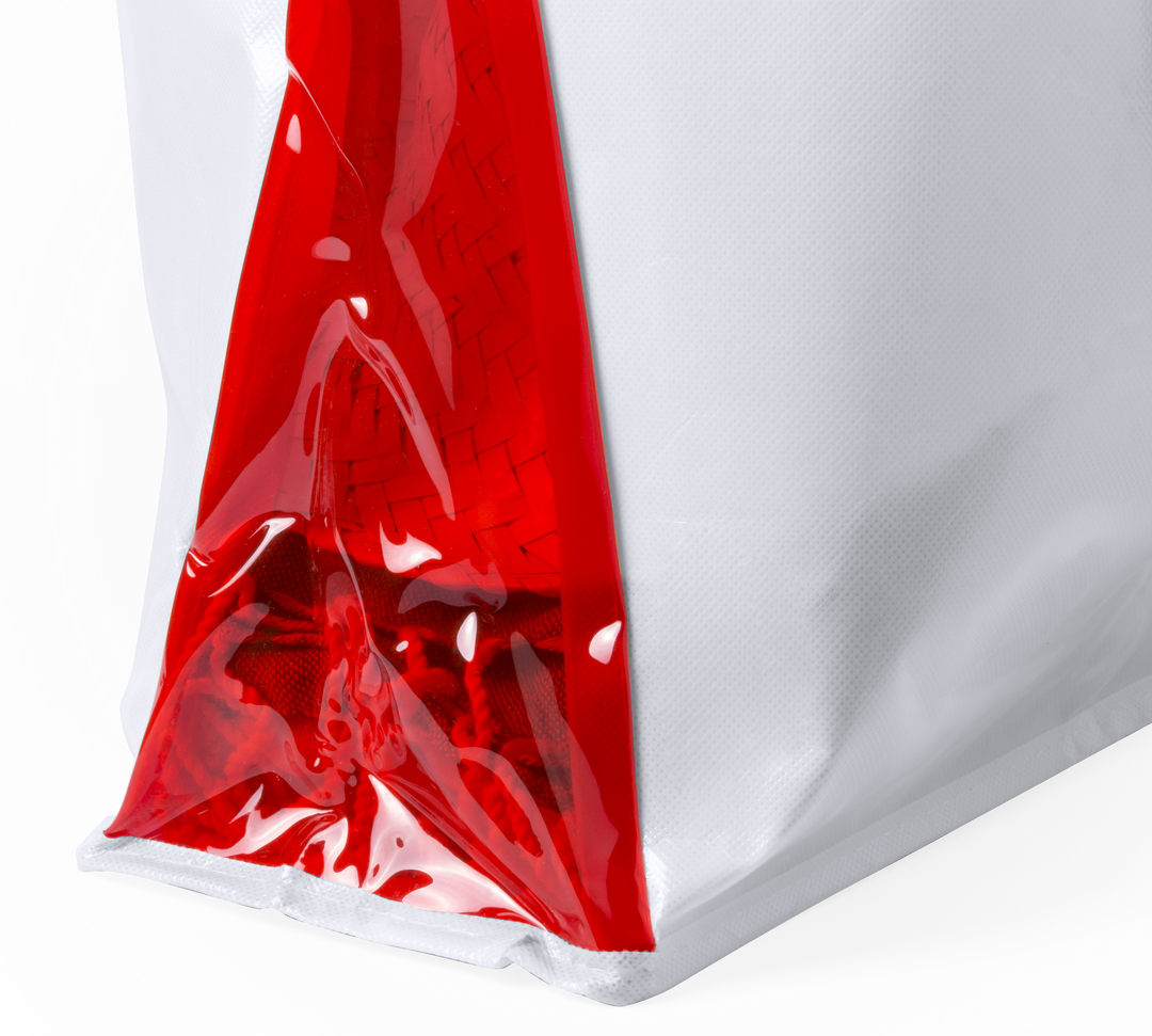 Bolsa de alta calidad en non-woven laminado de acabado metalizado de 150g/m2, en combinación de cuerpo en color blanco y asas y fuelles en variada gama de vivos colores. Con asas reforzadas largas de 58cm, fuelle en PVC reforzado con ribete y acabado cosi