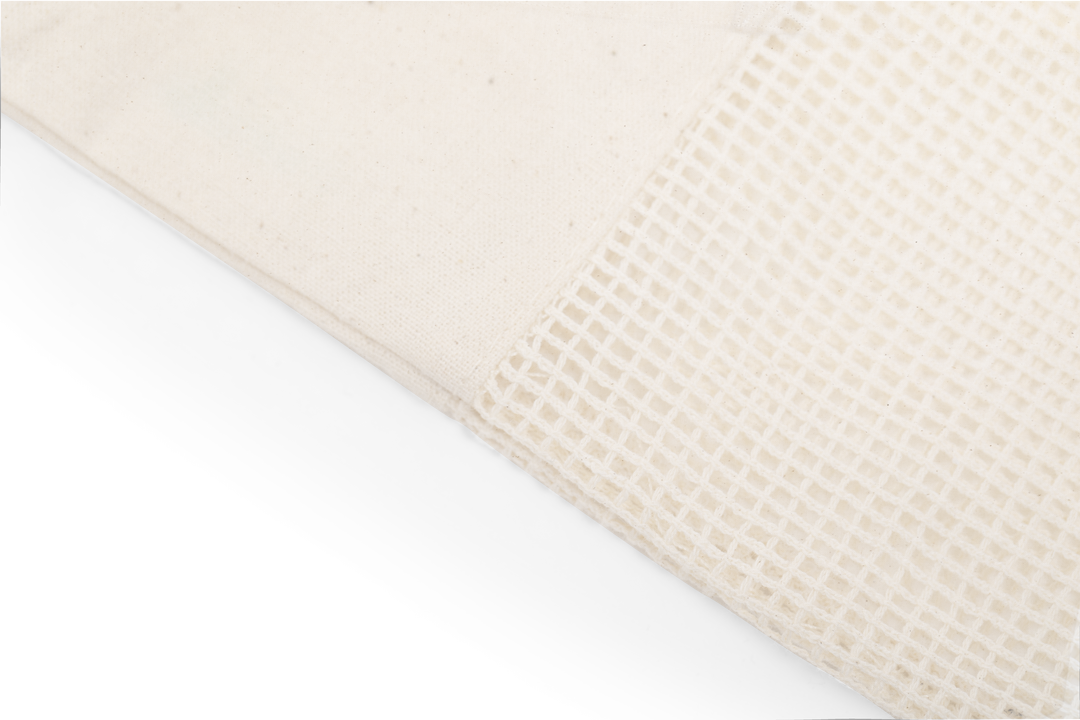 Bolsa de línea nature en resistente algodón de 170g/m2 y original acabado de rejilla. Asas largas en algodón, de 60 cm y reforzadas. Acabado cosido y resistencia hasta 8kg de peso.